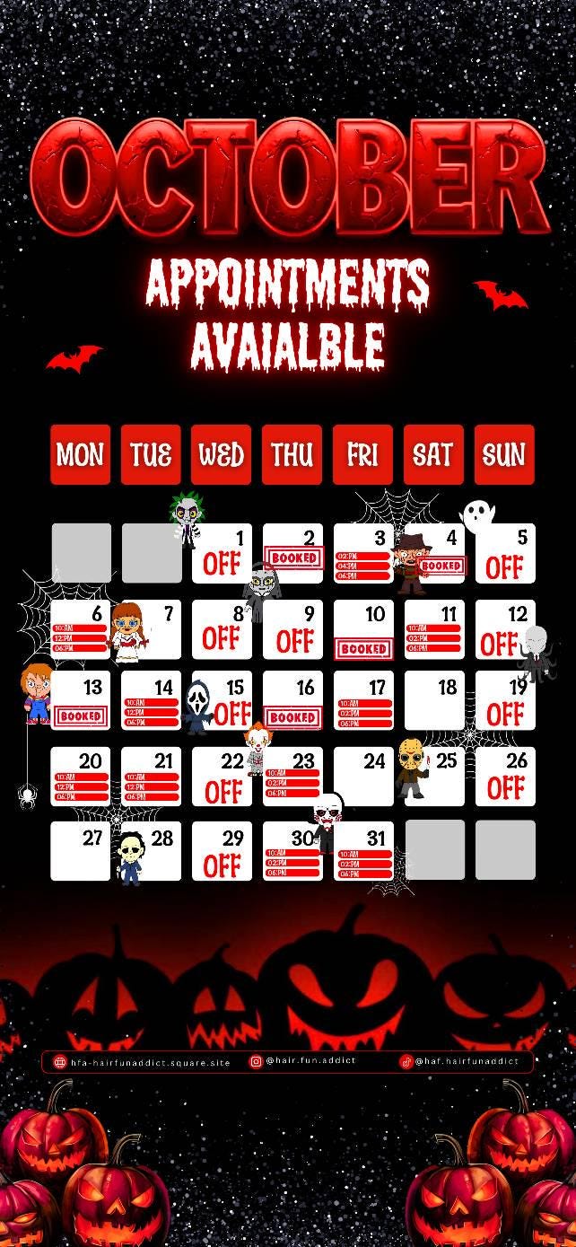 October Availability Calendar, Instagram Story Calendar, Halloween October Hairs Nails, Canva Template, Appointments Available, Diy Canva
