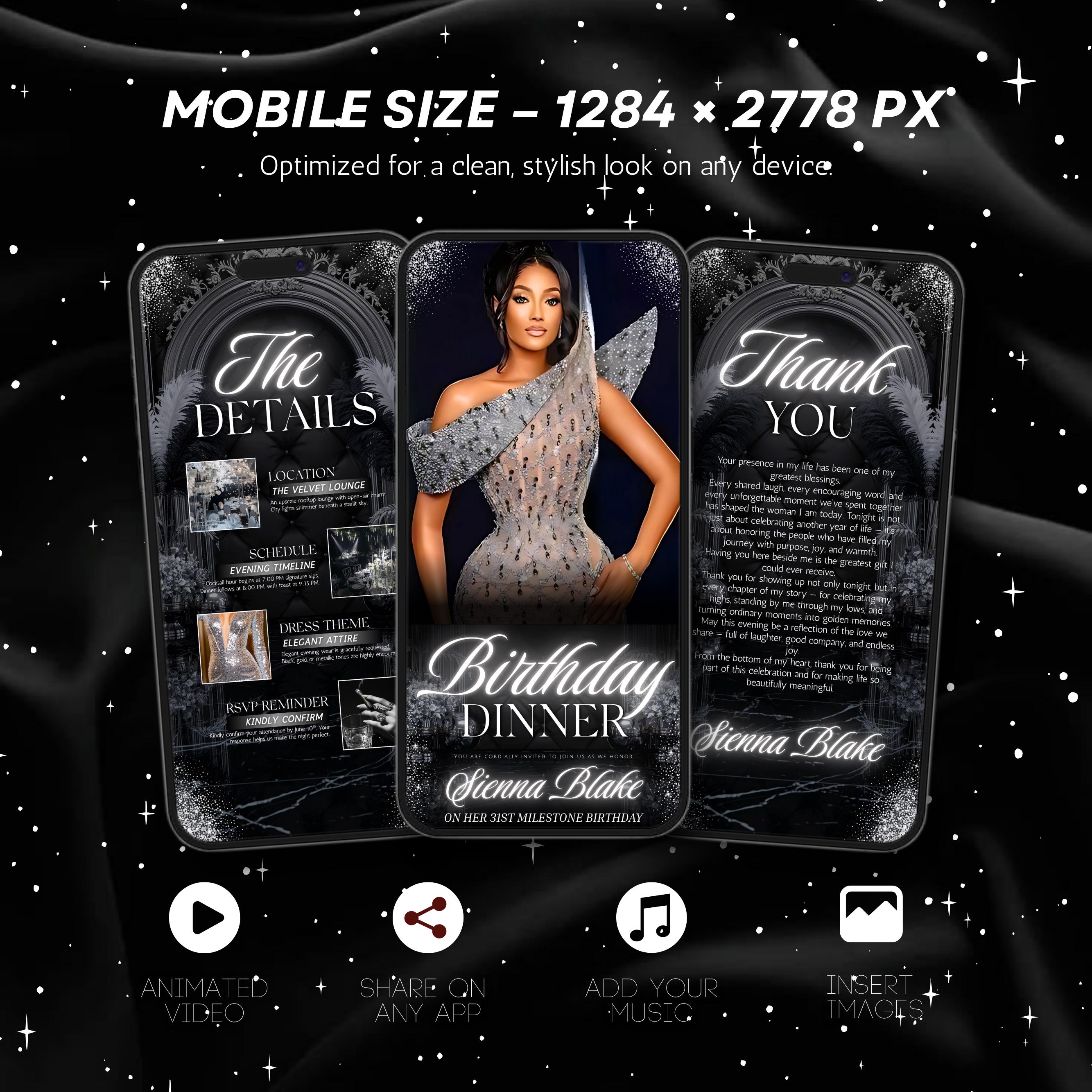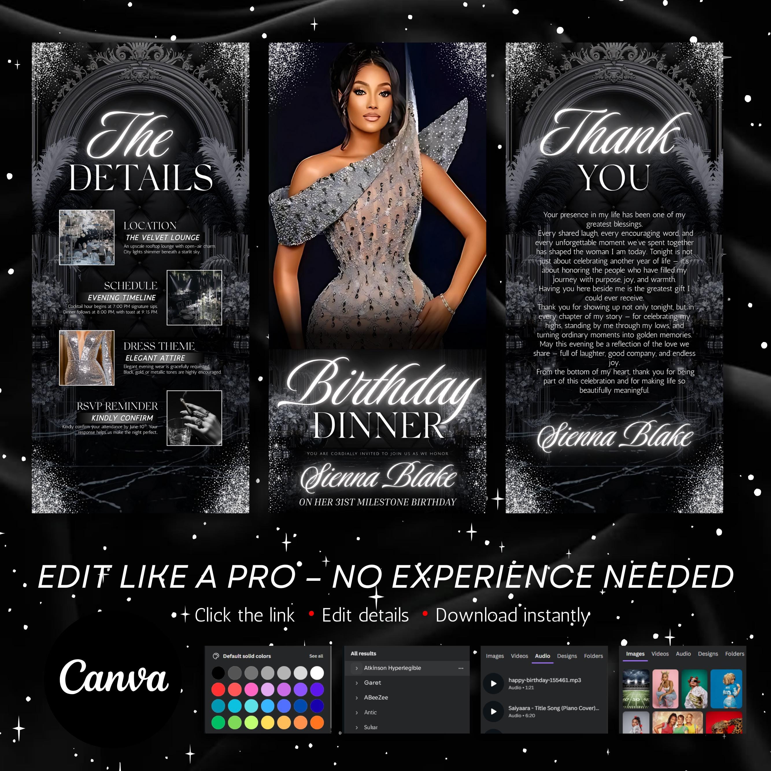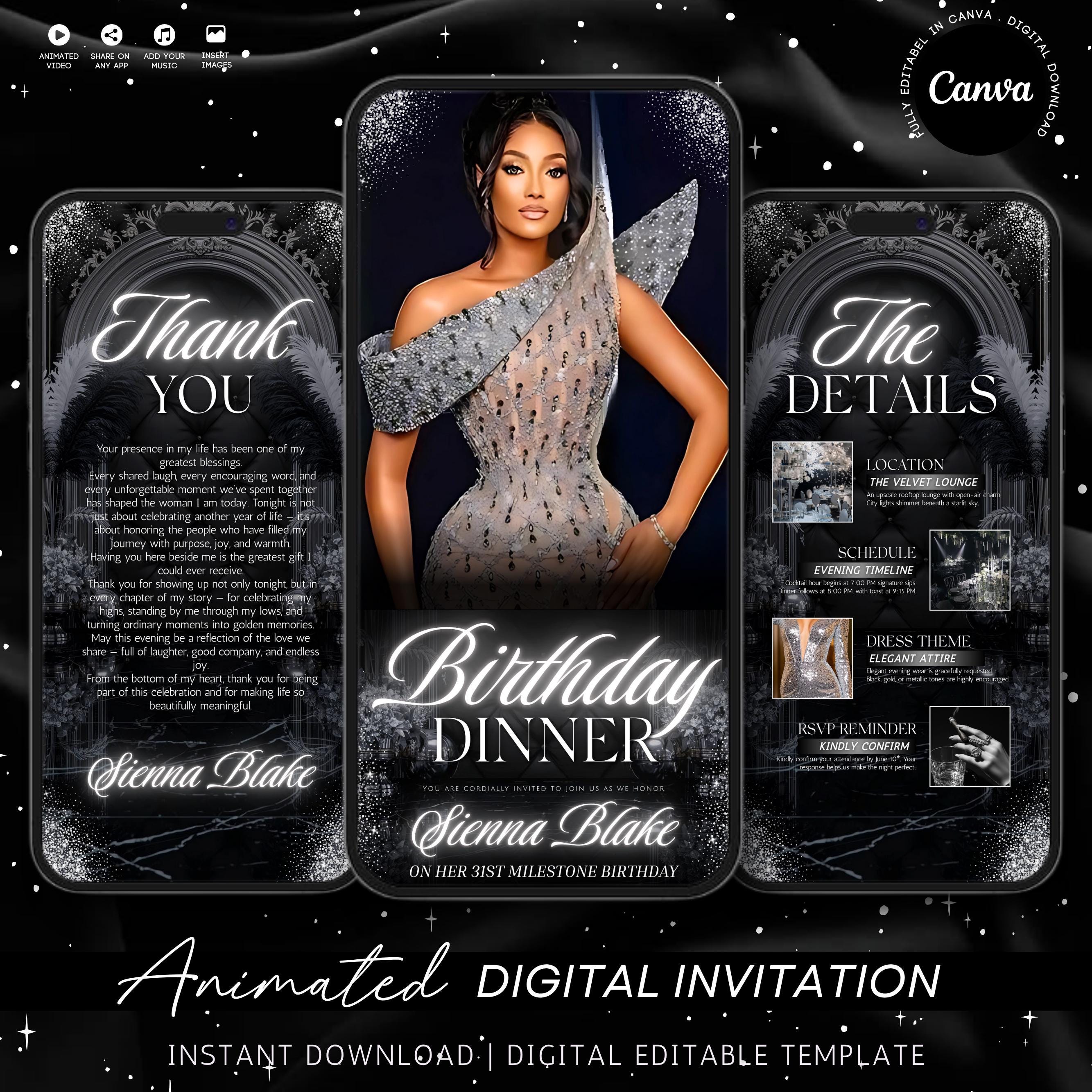 Digital Birthday Dinner invitation, Animated Digital Birthday Dinner Party, birthday evite, Music, Text, Birthday Party, Canva Editable