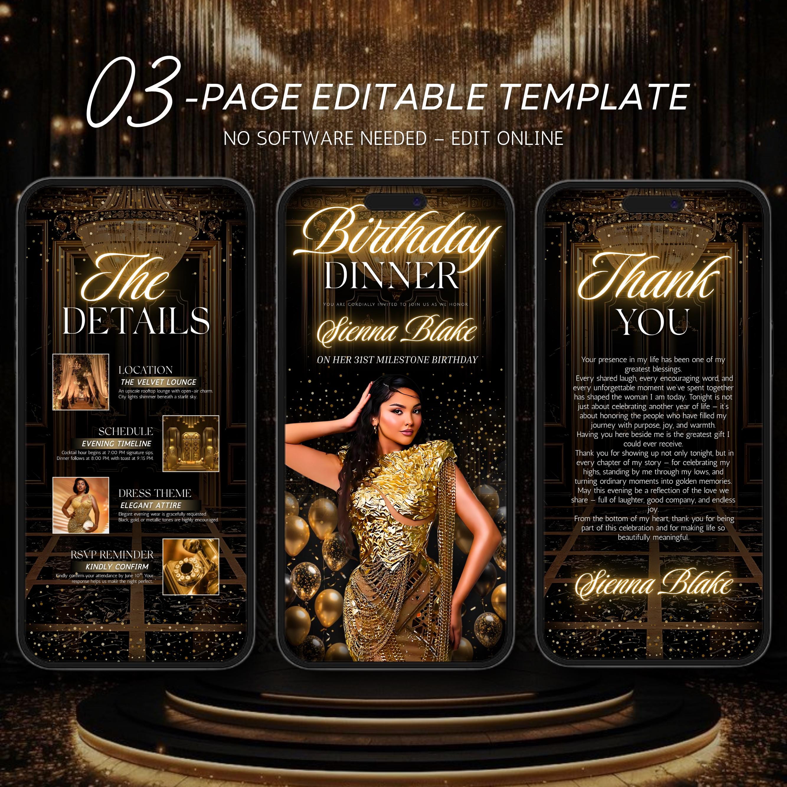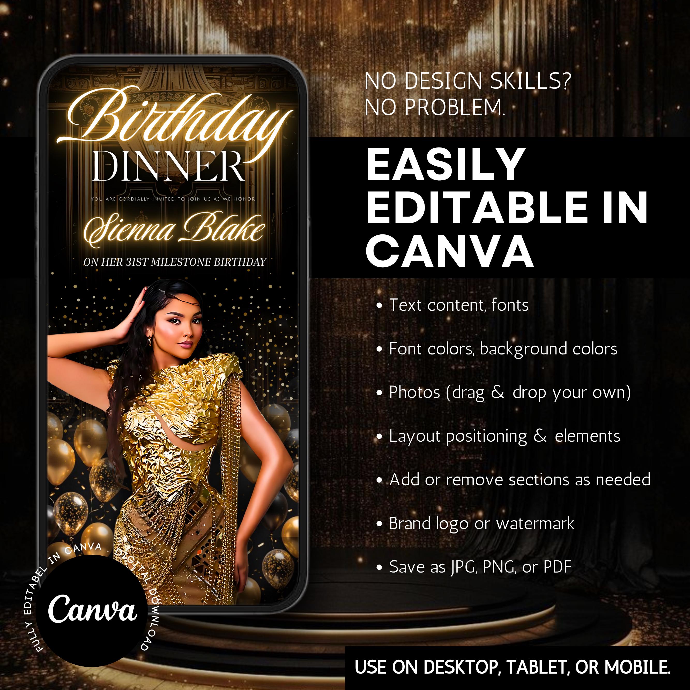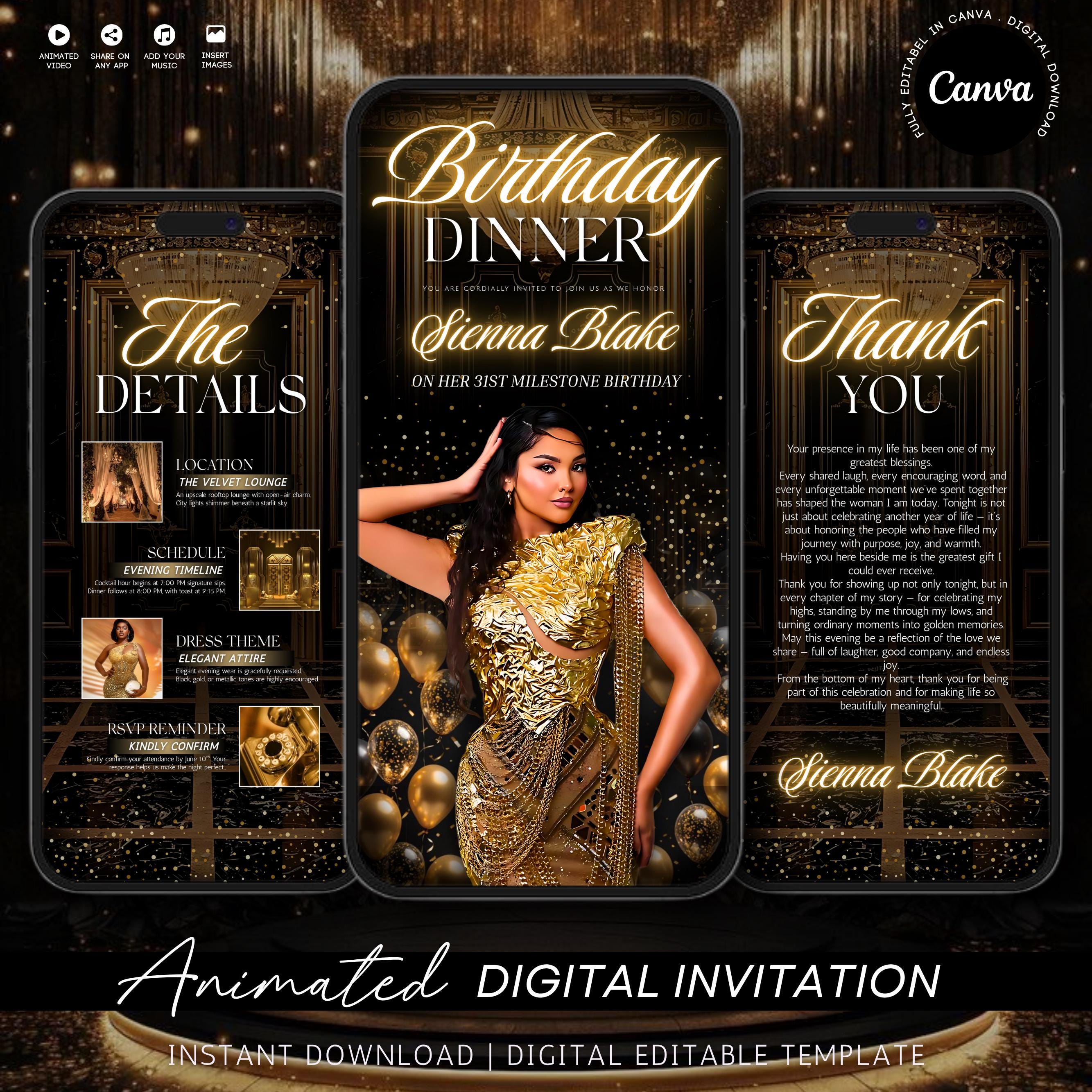 Digital Birthday Dinner Invitation, Luxury Black and Gold Birthday Party Invitation Video Template, Women’s 30th 40th 50th, Canva Editable