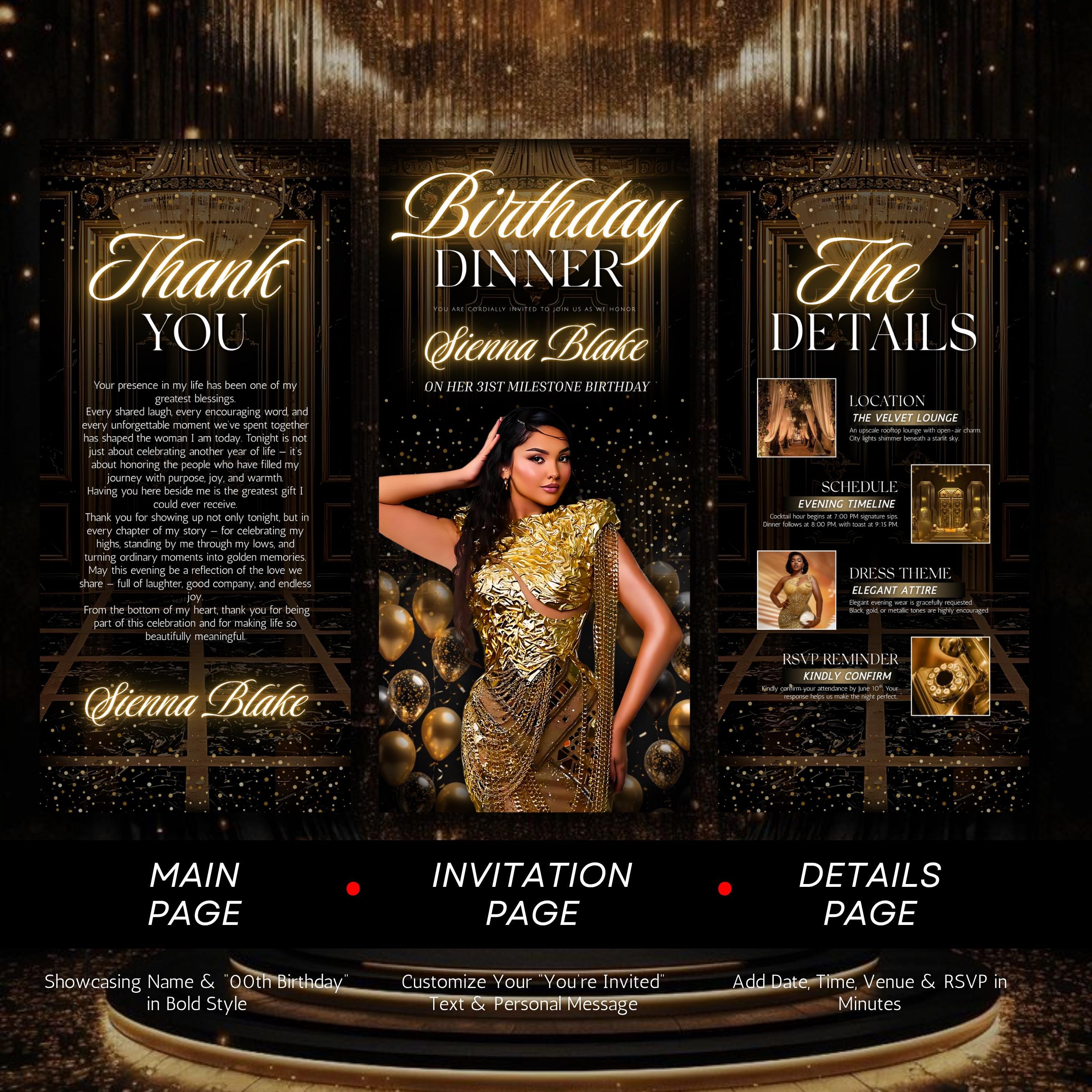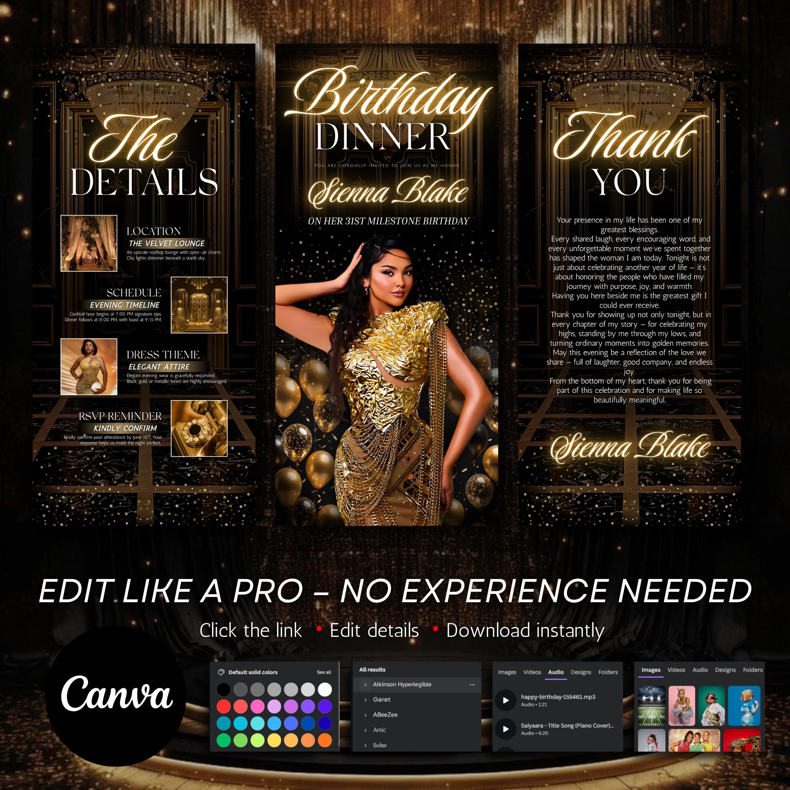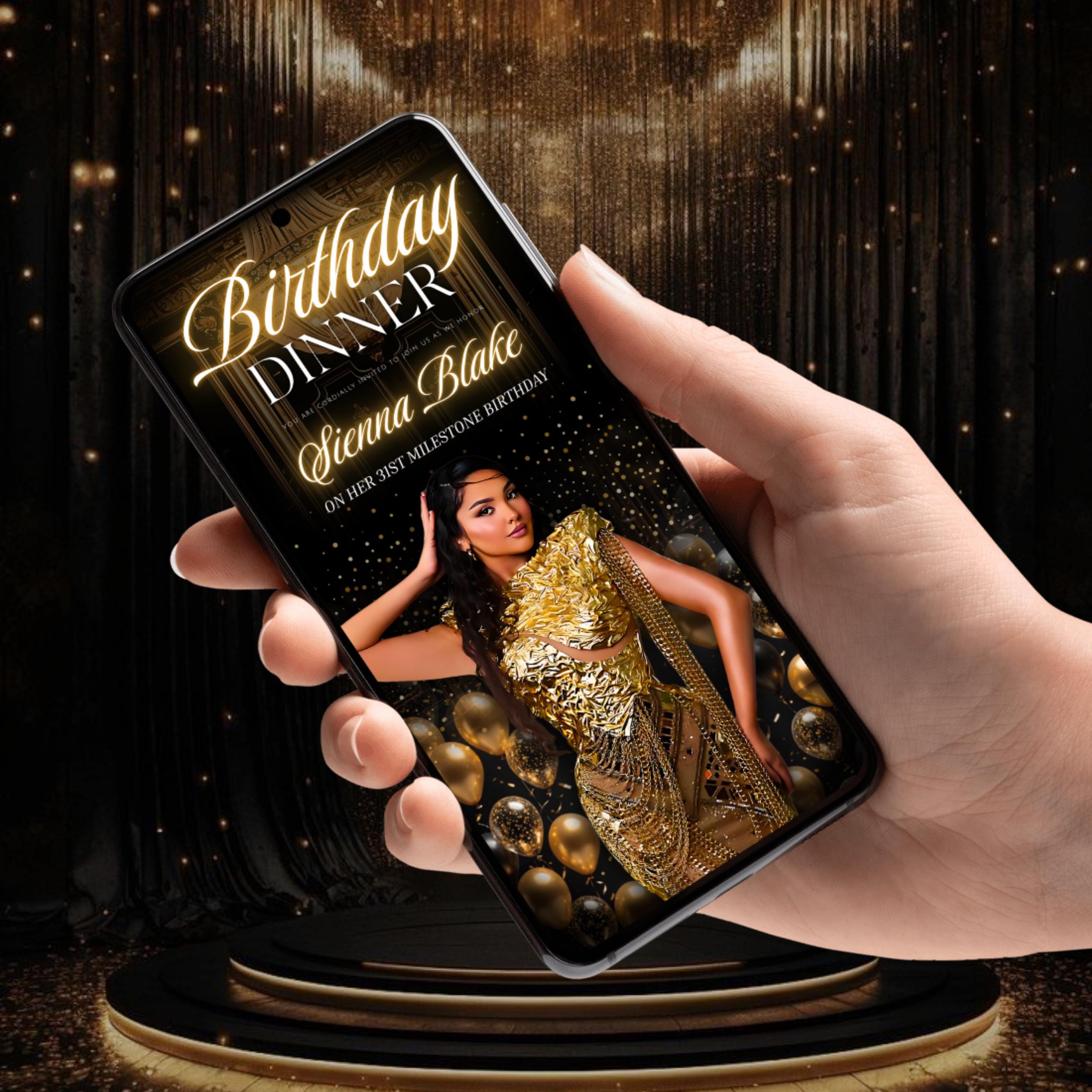 Digital Birthday Dinner Invitation, Luxury Black and Gold Birthday Party Invitation Video Template, Women’s 30th 40th 50th, Canva Editable