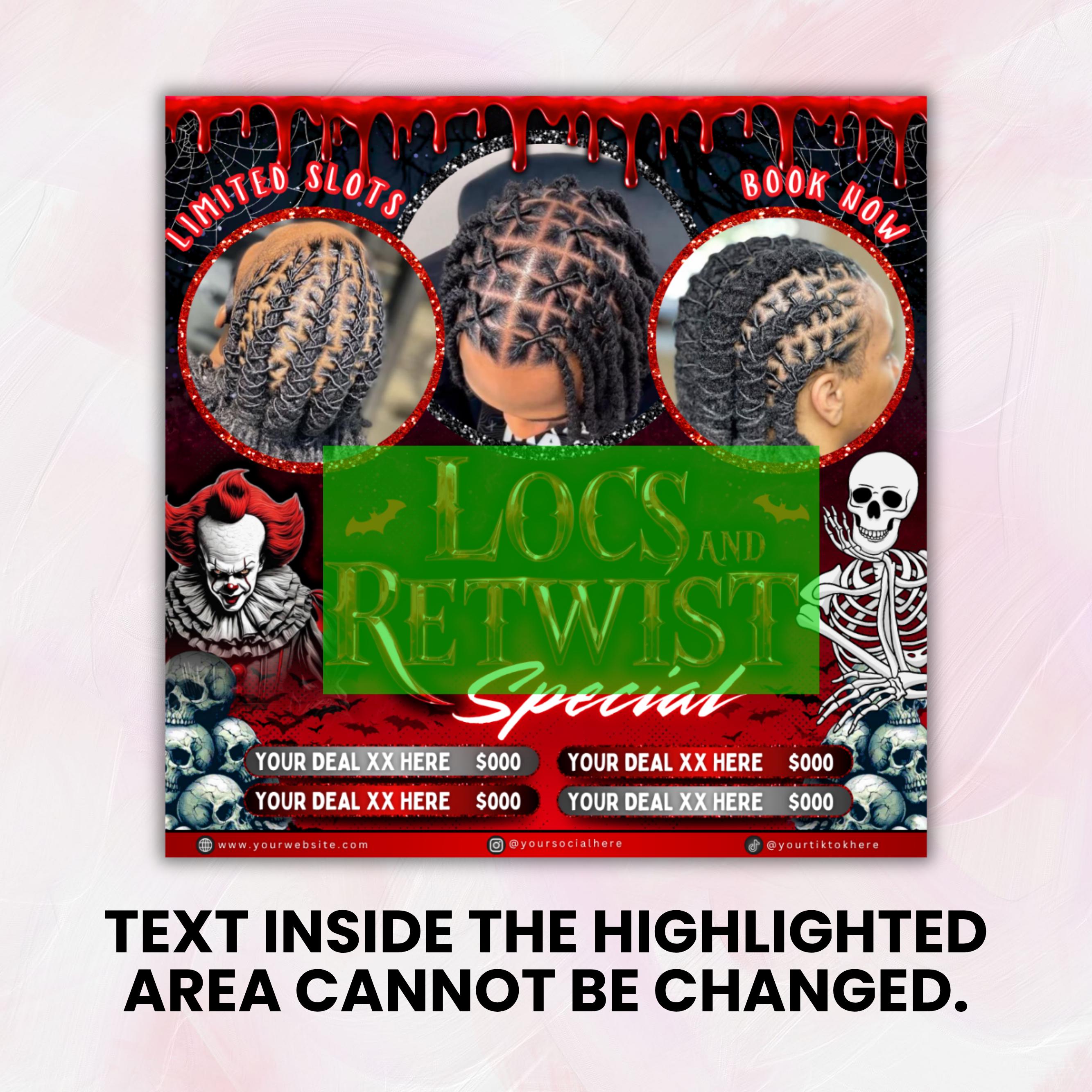 Locs & Retwist Flyer, October Hair Specials, Spooky Szn Booking Template, Spooktober Braids, Loctician Hairstylist Flyer, Editable Canva