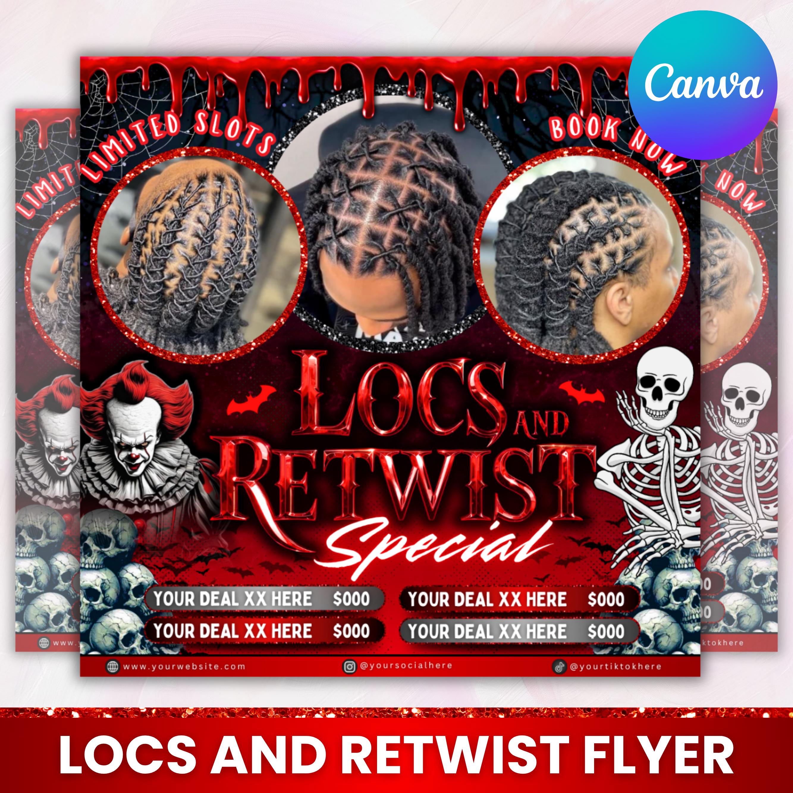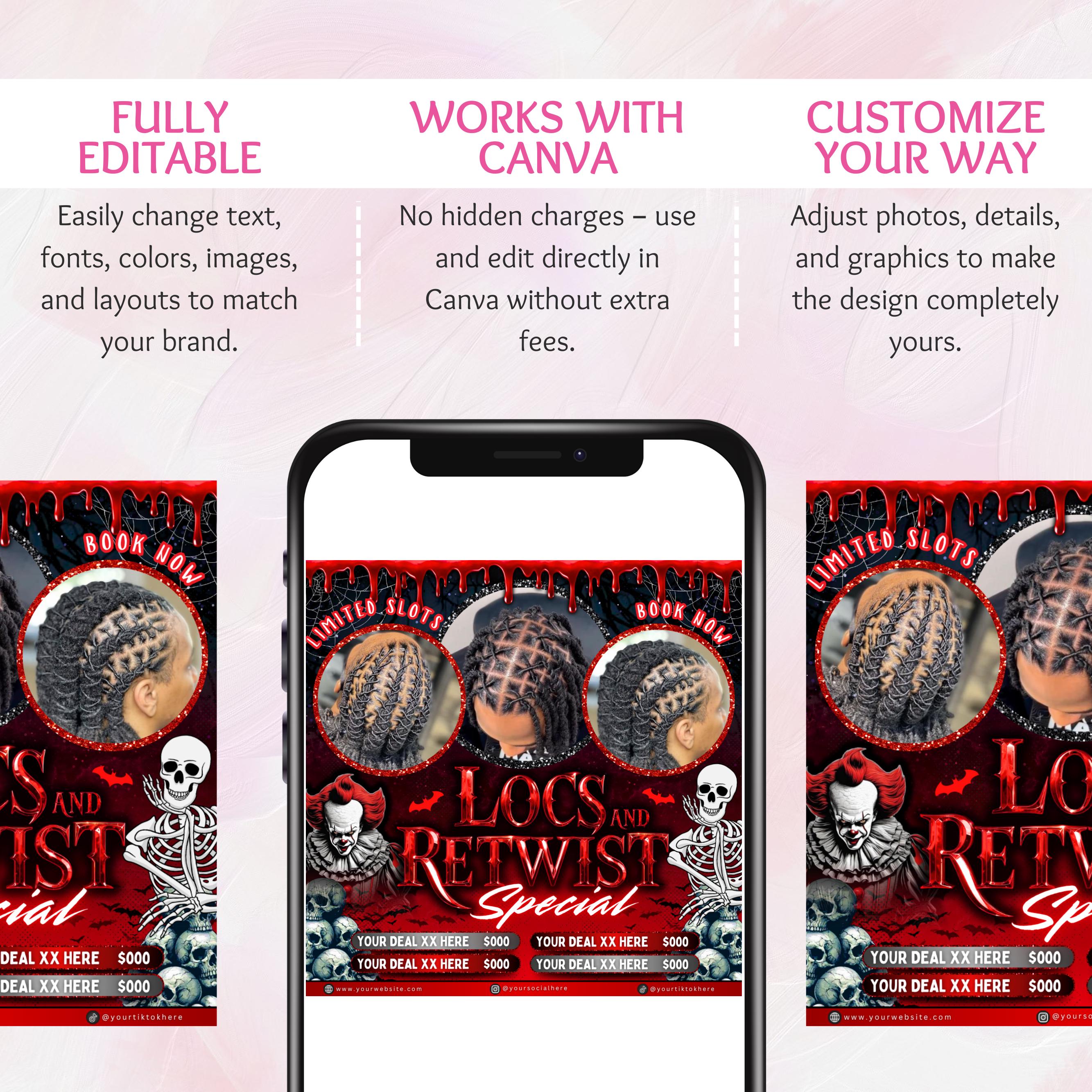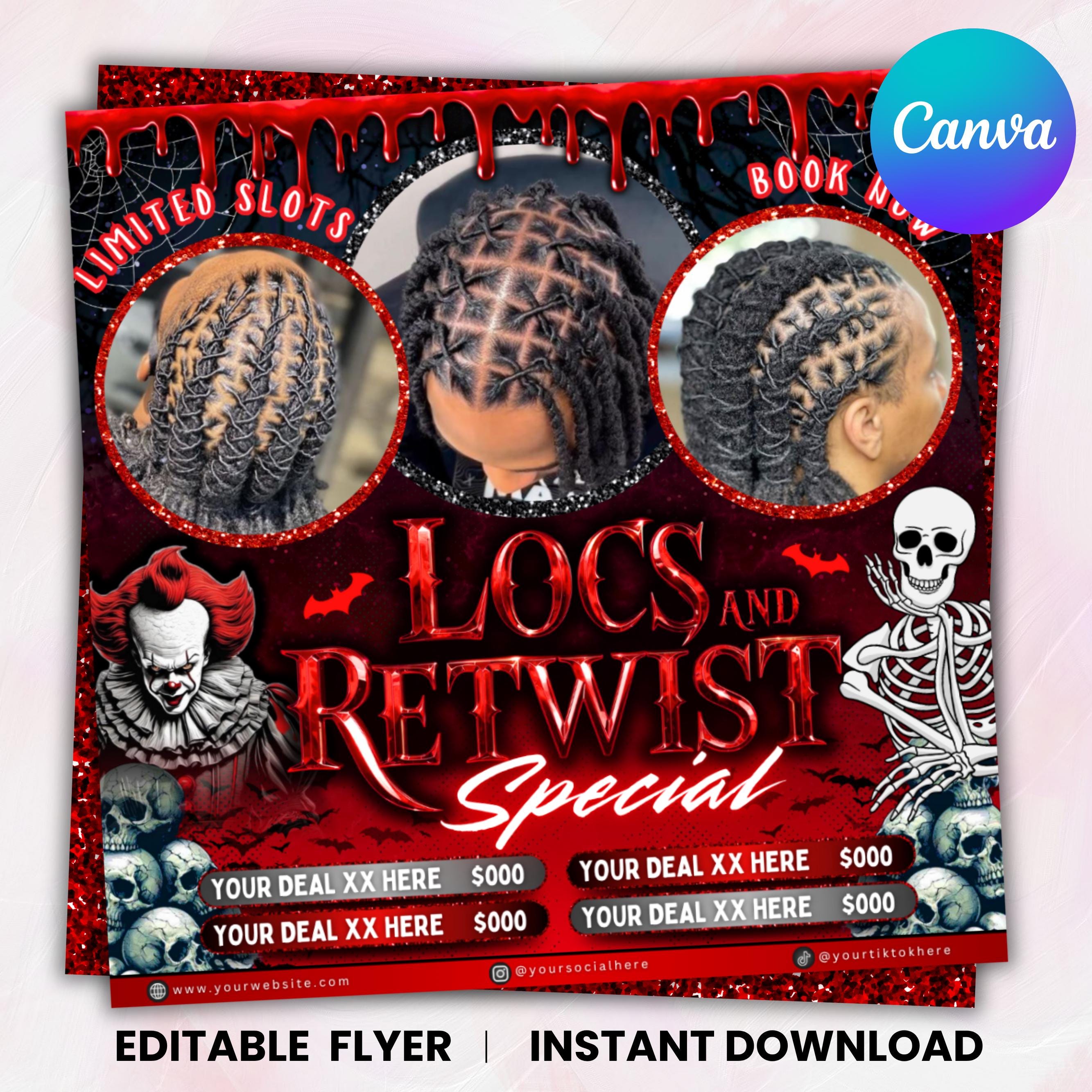 Locs & Retwist Flyer, October Hair Specials, Spooky Szn Booking Template, Spooktober Braids, Loctician Hairstylist Flyer, Canva Editable