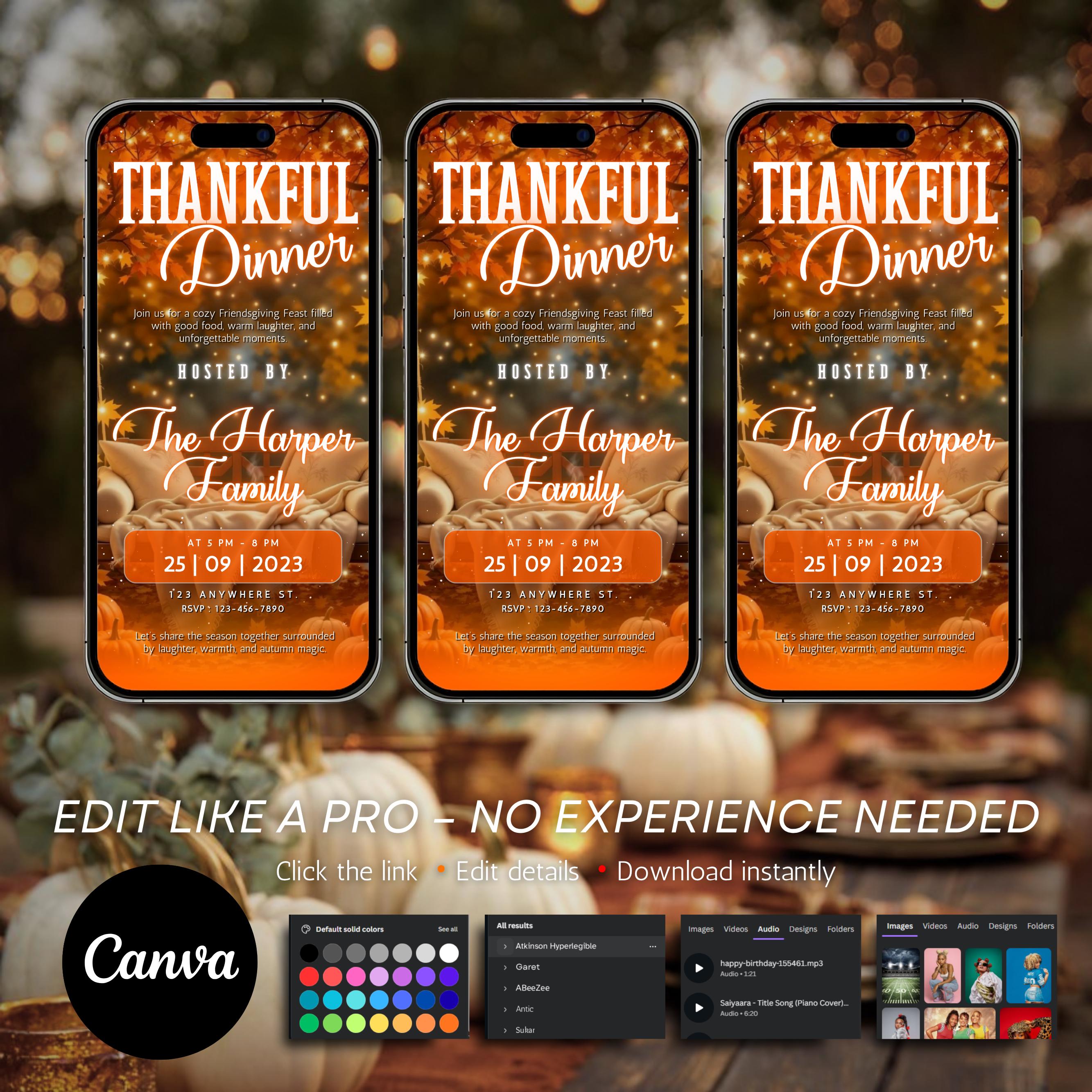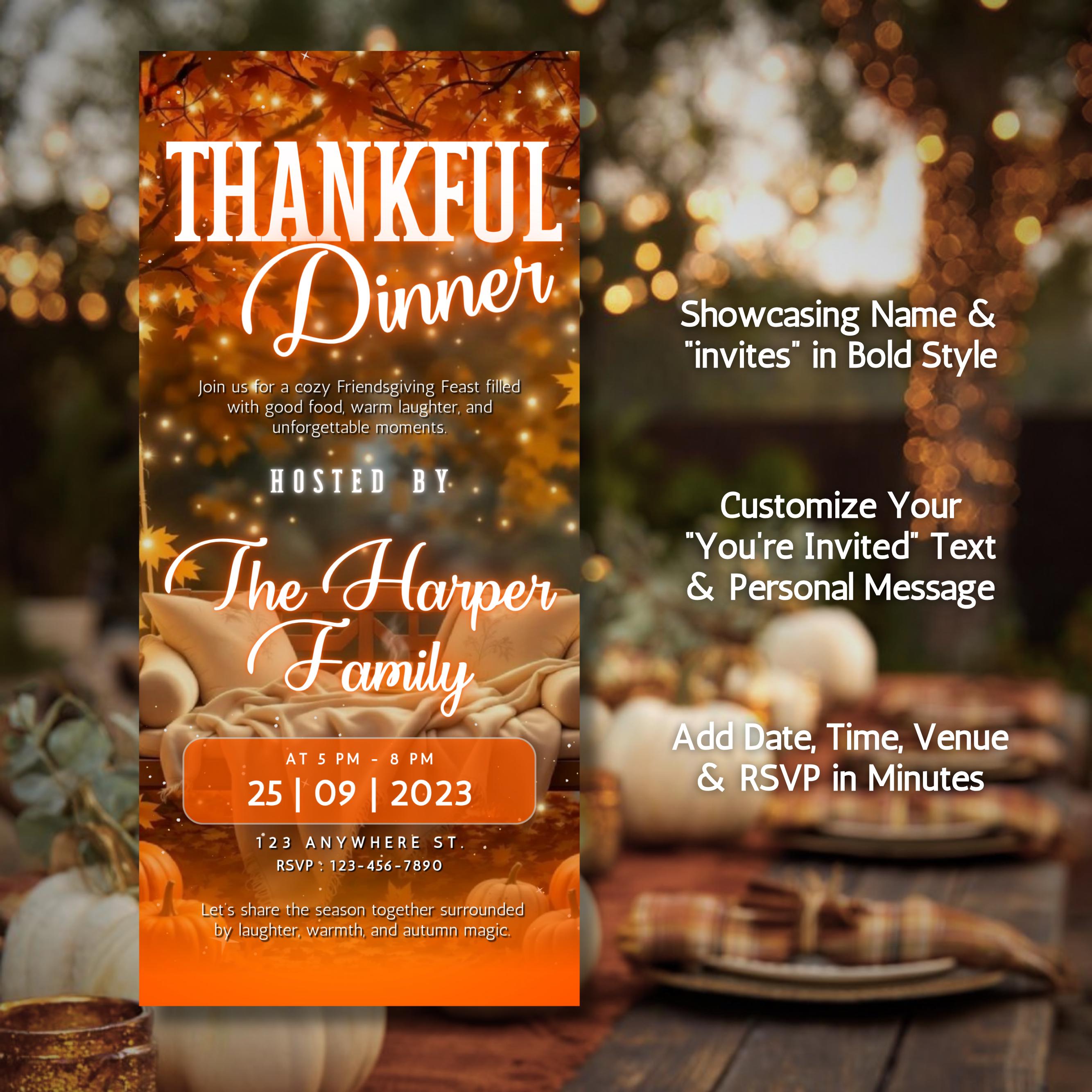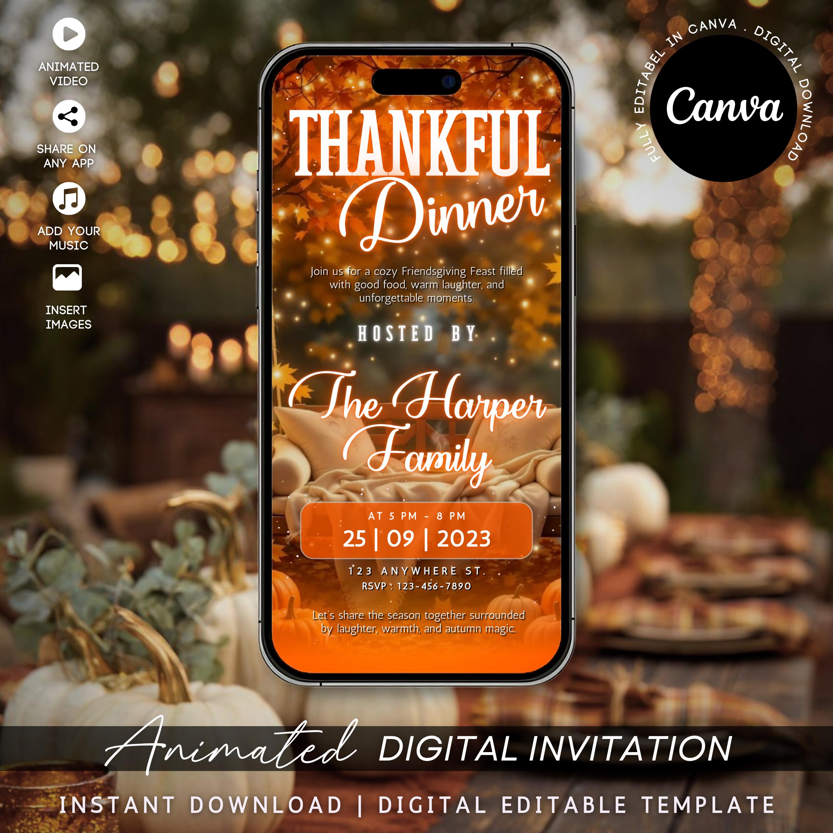 Animated Thanksgiving Cozy Pumpkin Dinner Invitation: Editable Thanksgiving Invite Digital Download Template Fall Dinner Celebration Invite