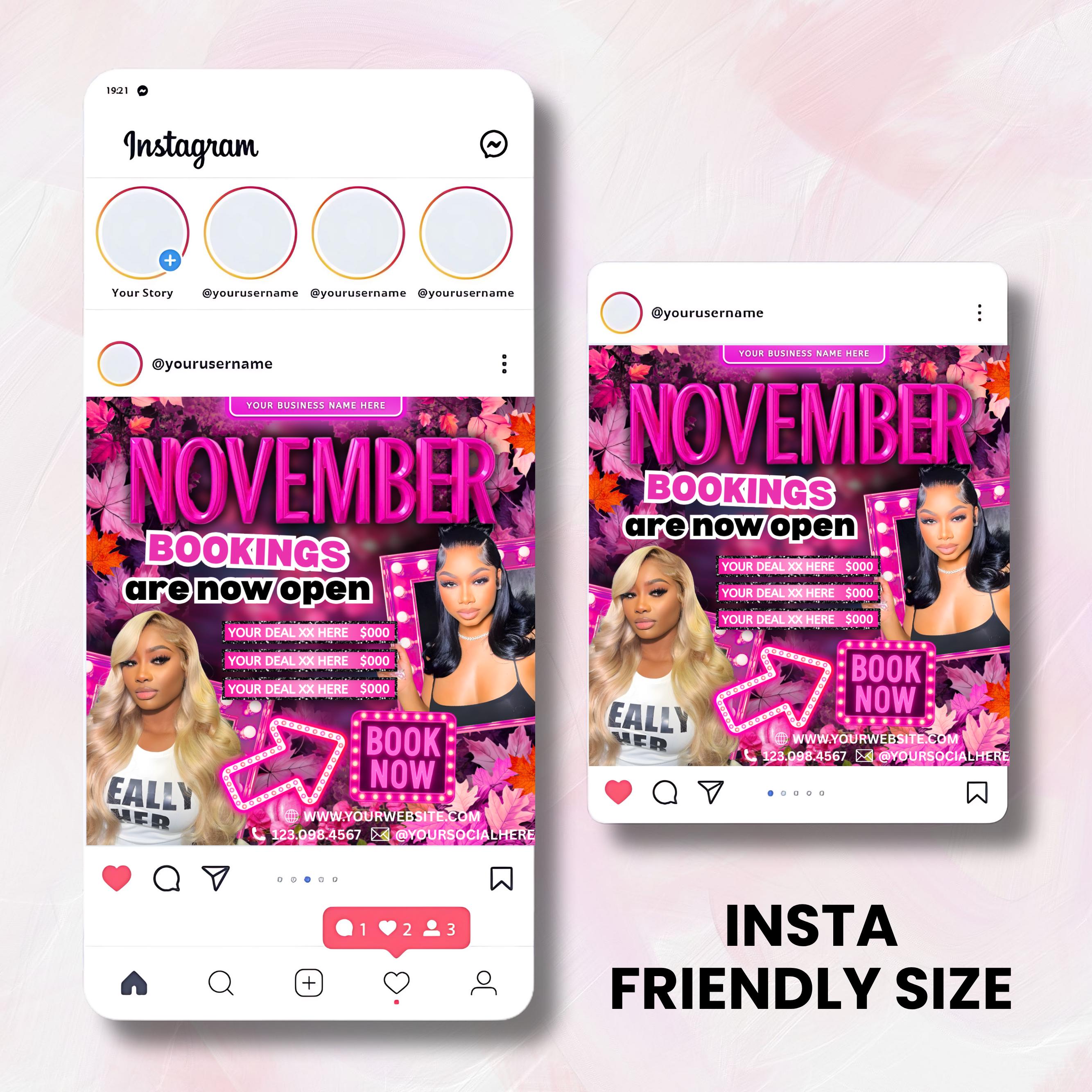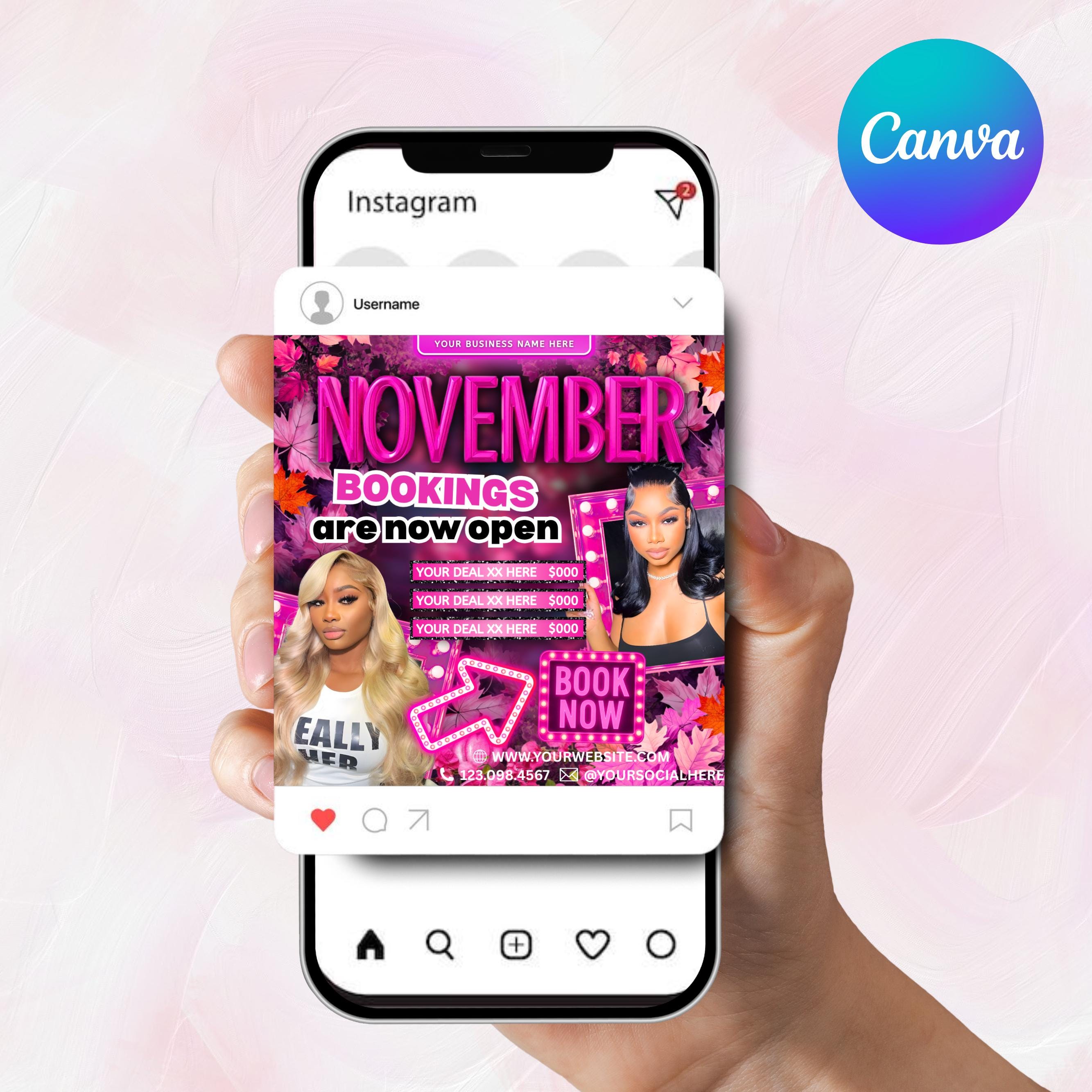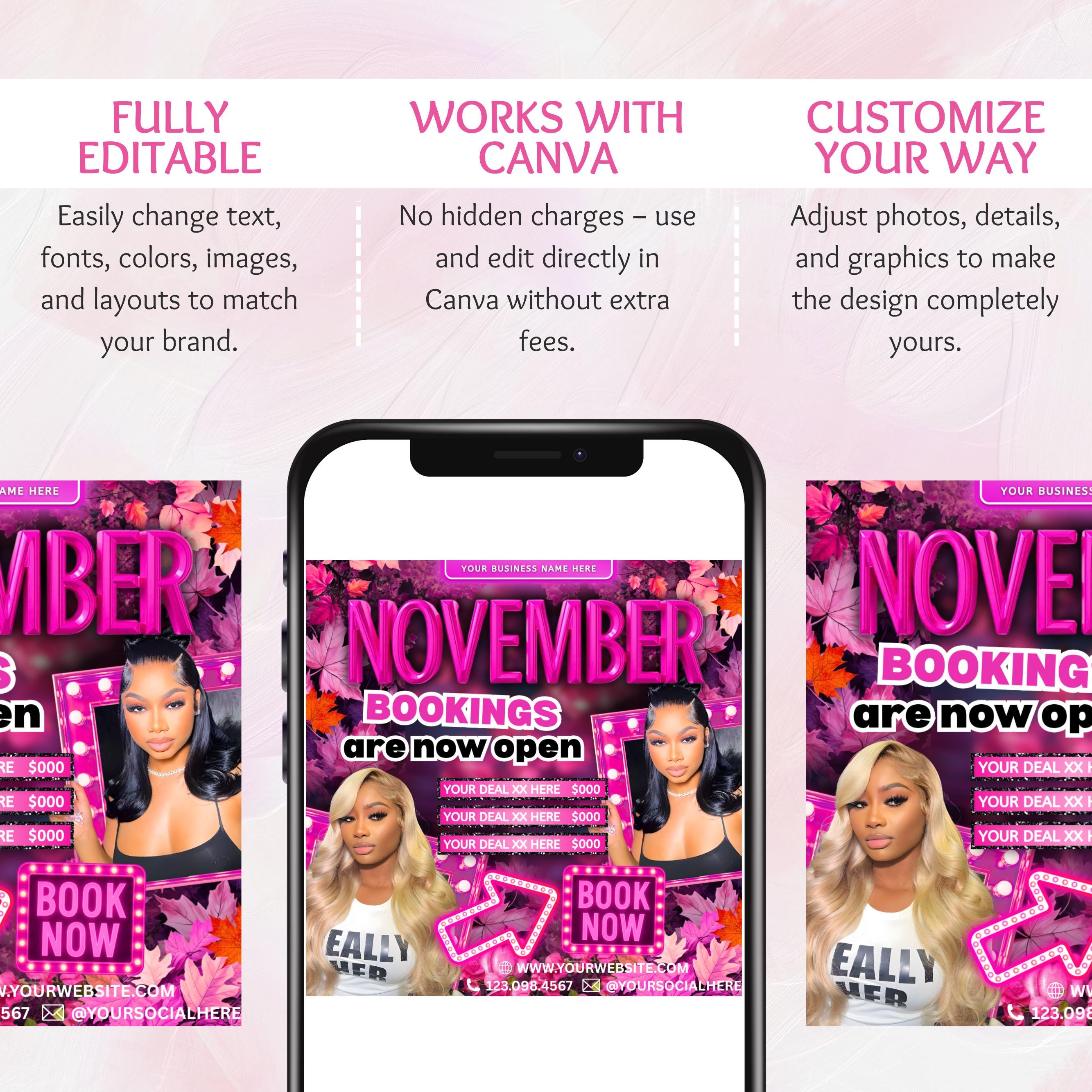 November Booking Flyer, Fall Szn Booking Flyer, Thanksgiving Book Now, November Hair Lash Nail Braids MUA Wig Autumn Flyer, Canva Editable