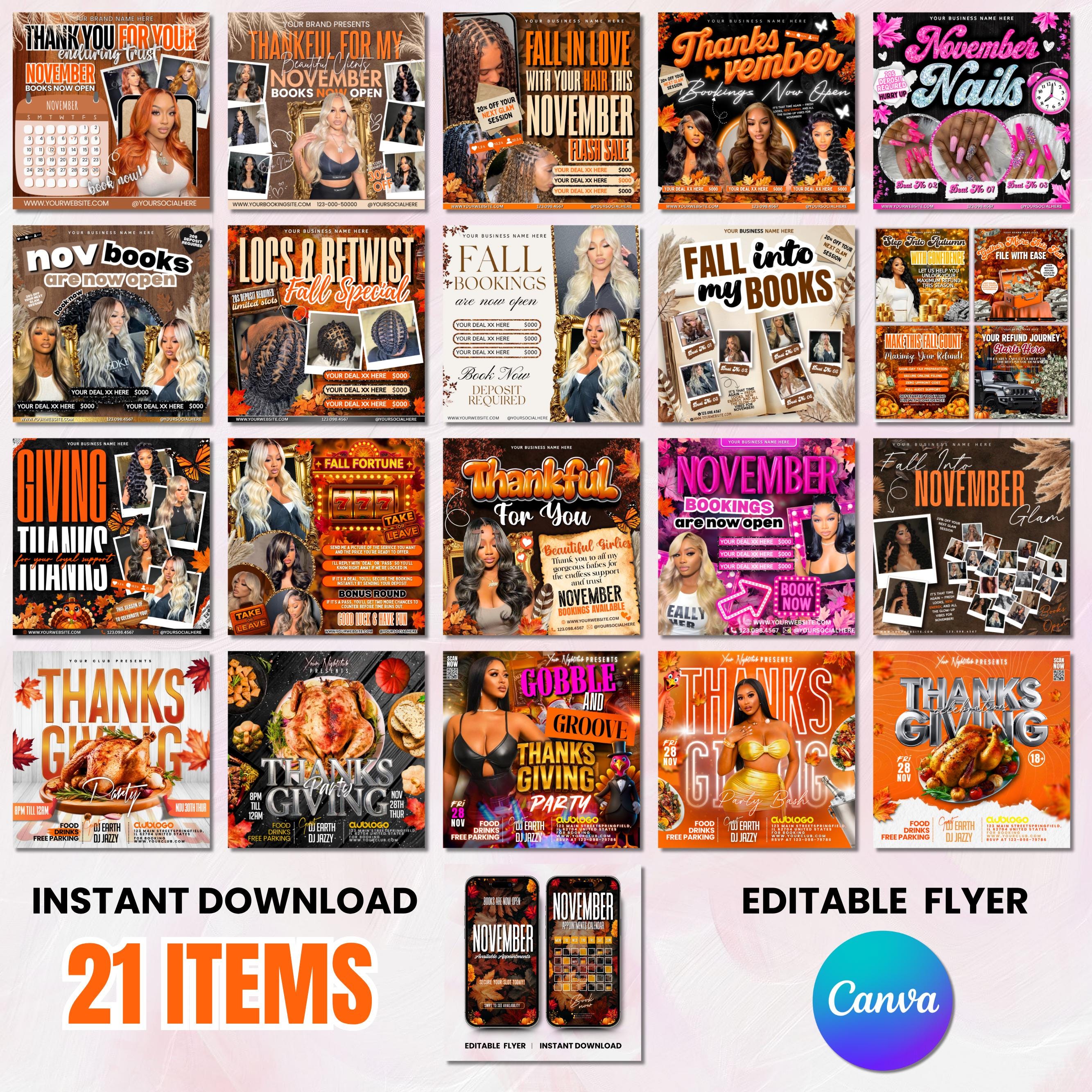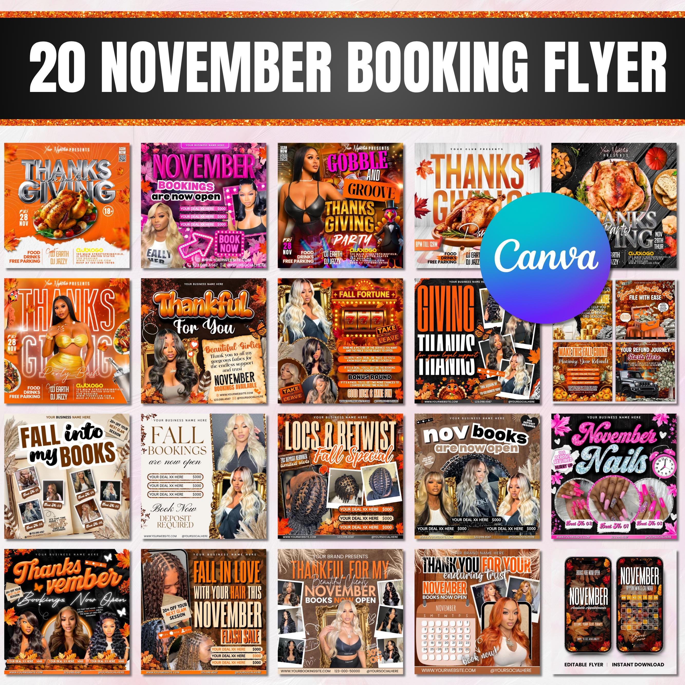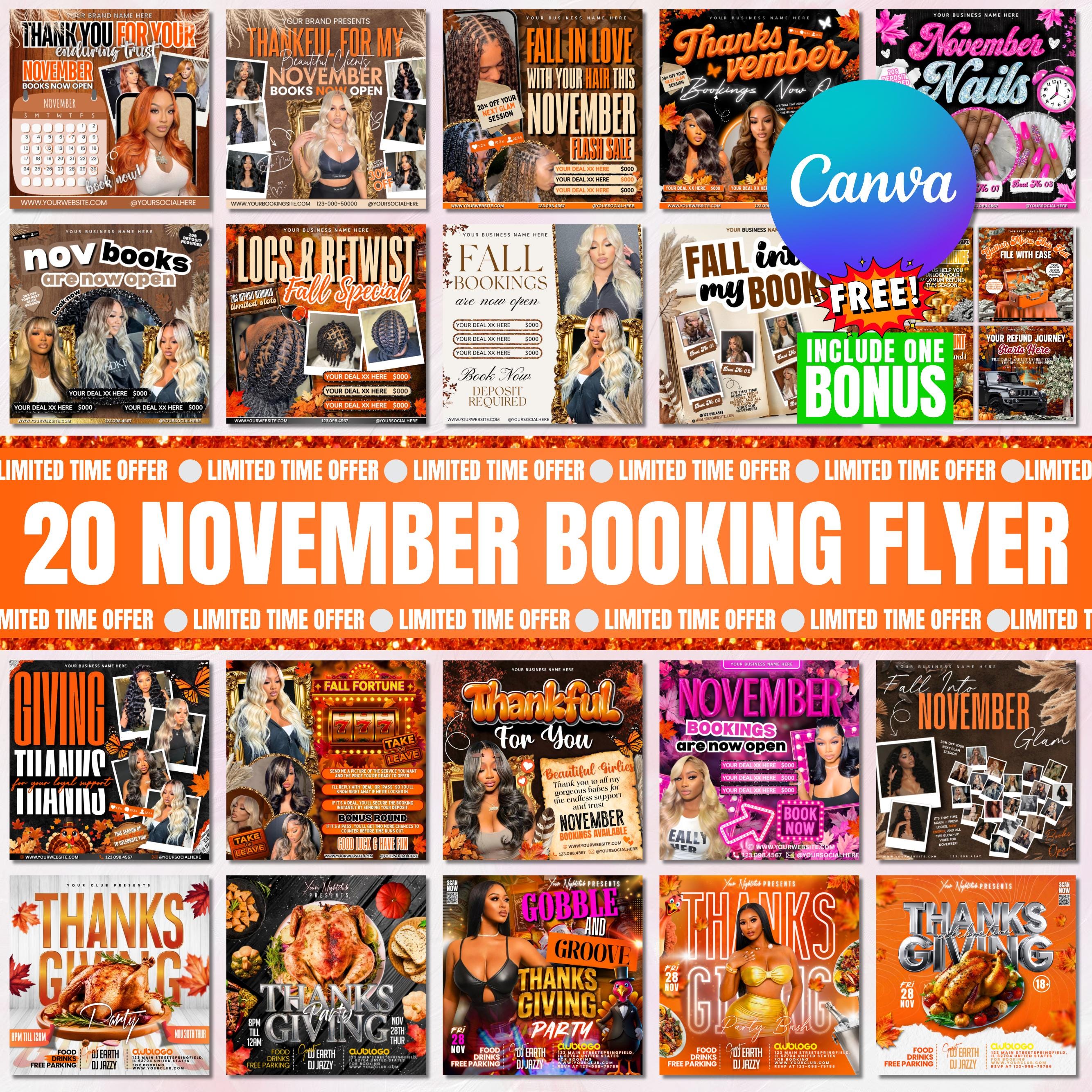 November Booking Flyer Bundle, Thanksgiving flyers, Fall Season Booking flyer, November Books Open, Flyers Templates, DIY Canva Editable