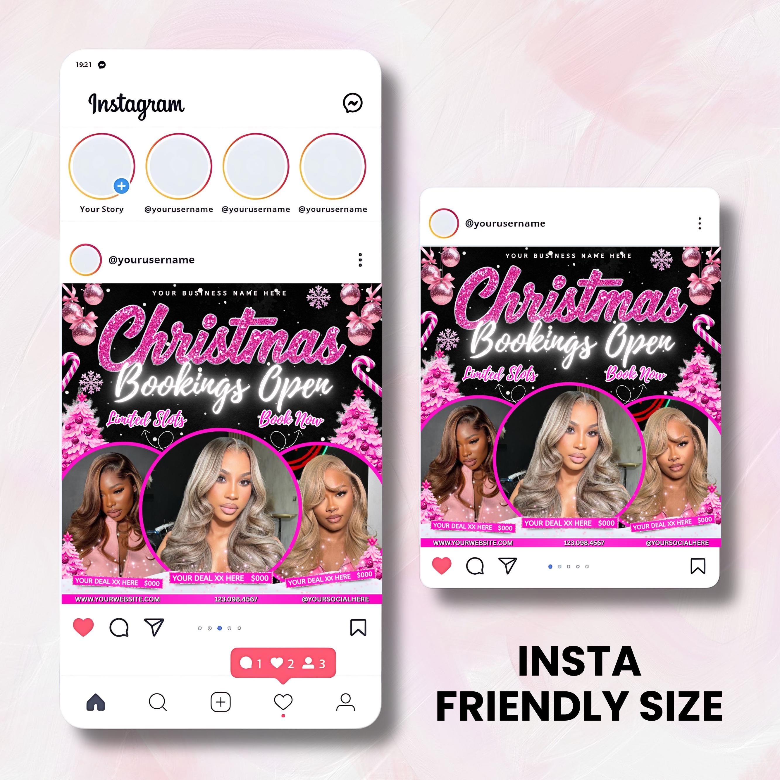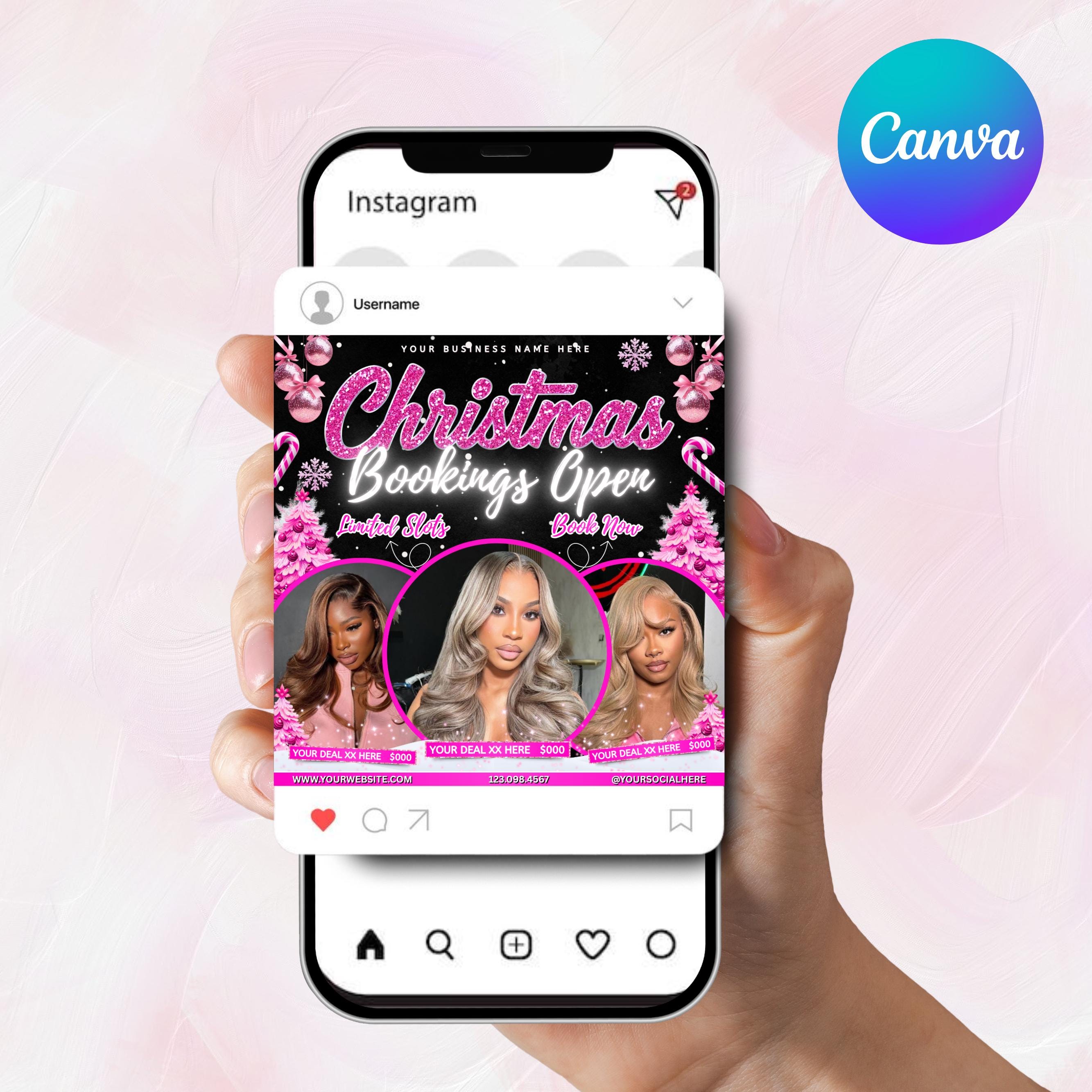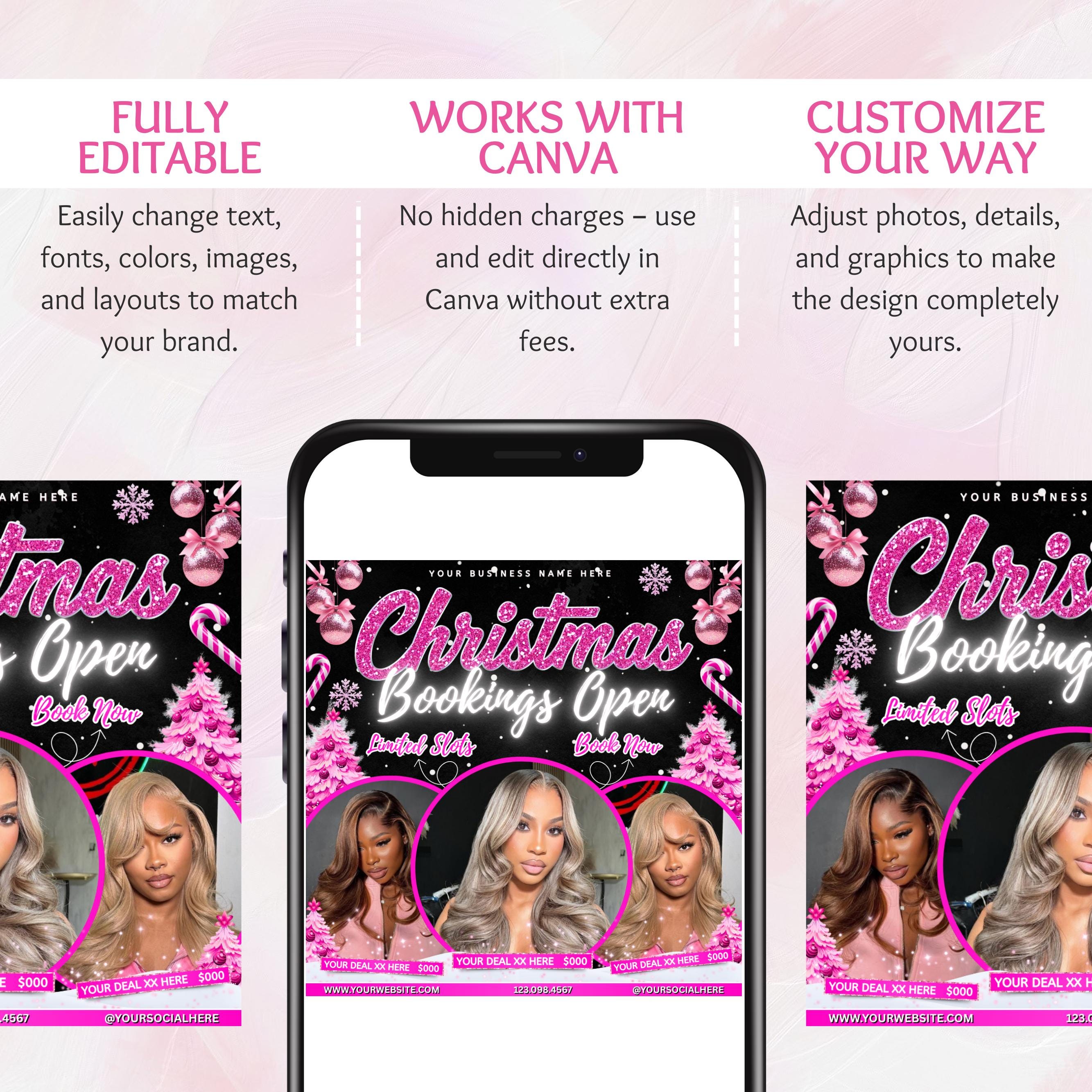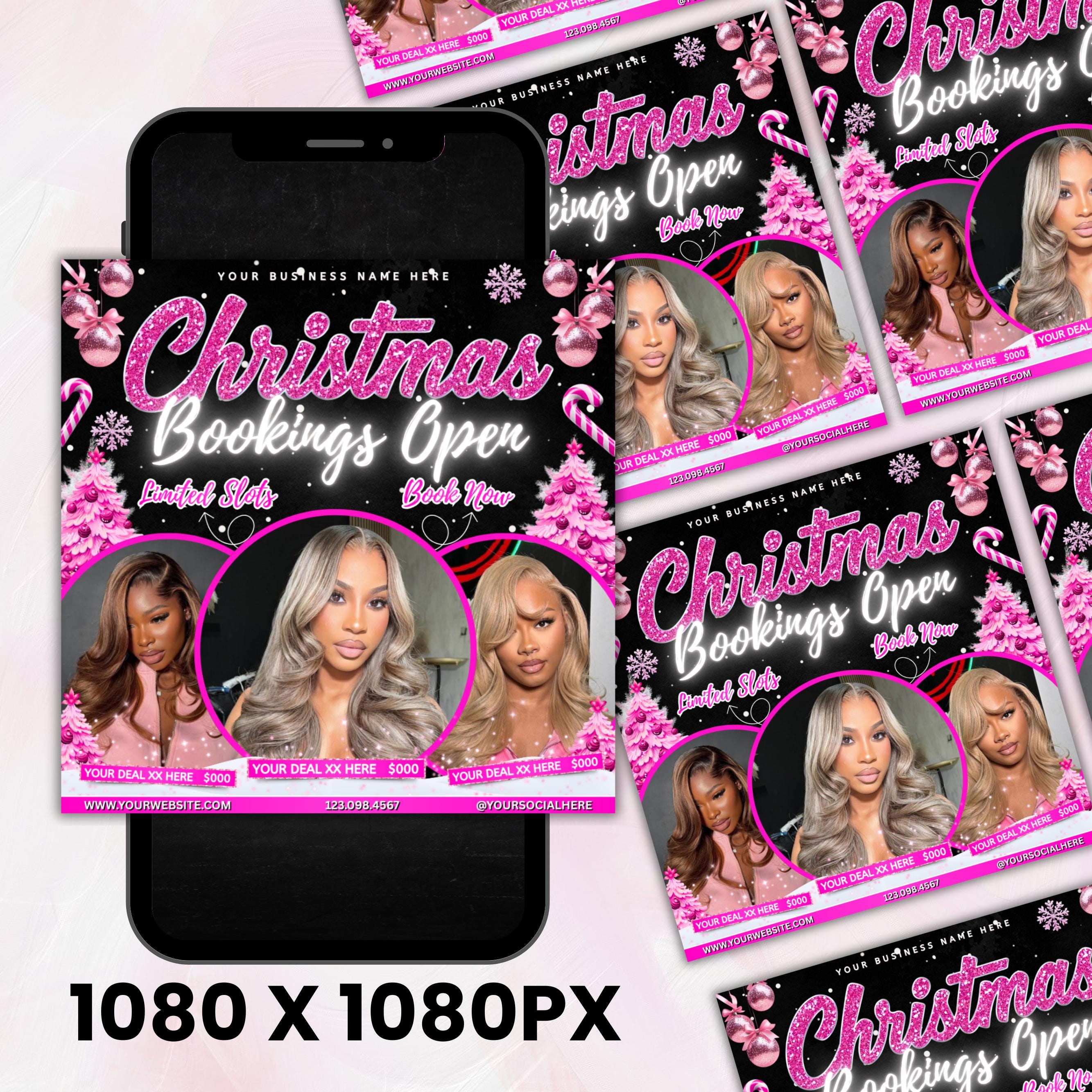 Christmas Booking Flyer, December Booking Flyer, Pink Christmas Flyer, Winter Booking Flyer, Hair, Lash, Makeup, Nails, Wig, Canva Editable