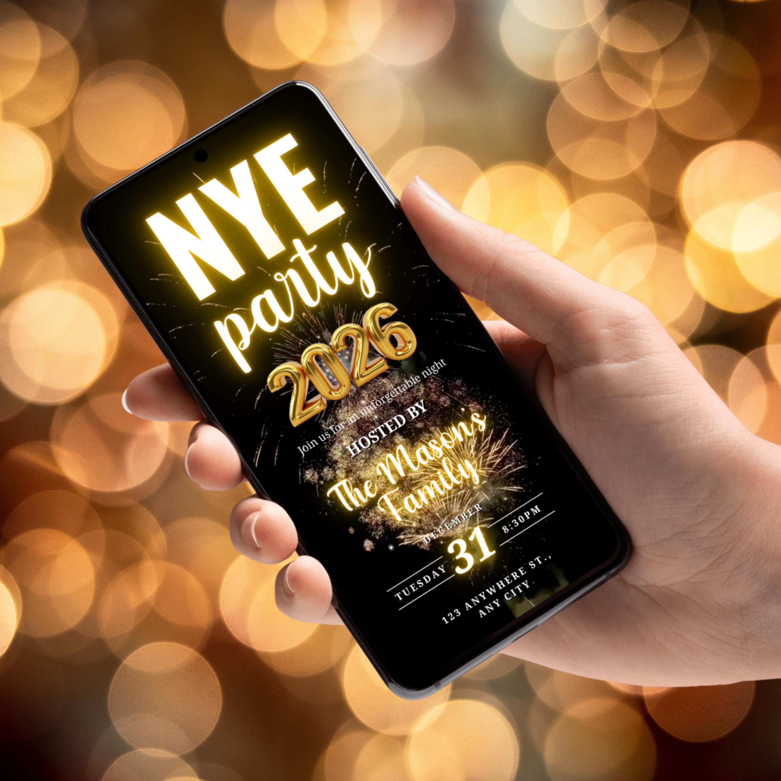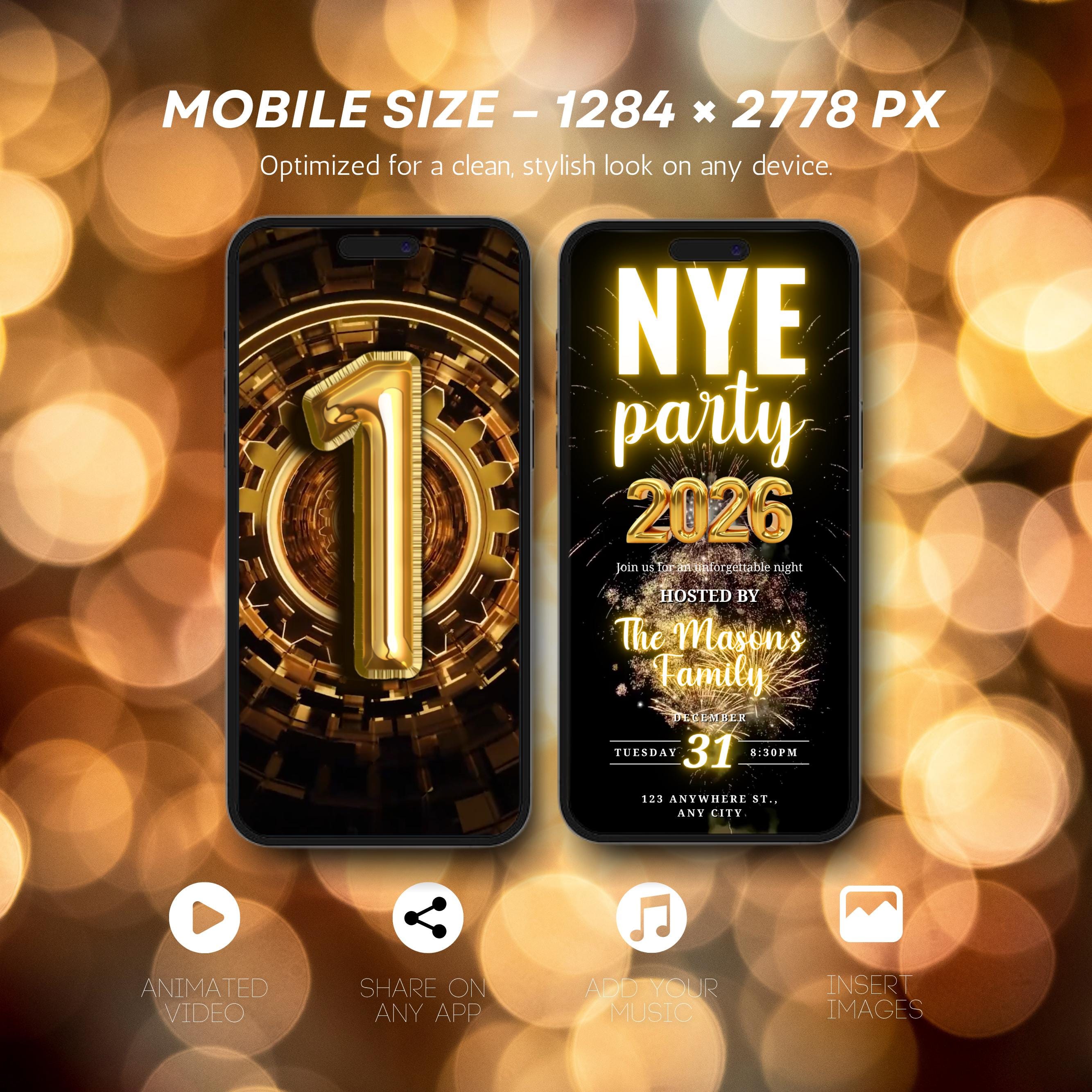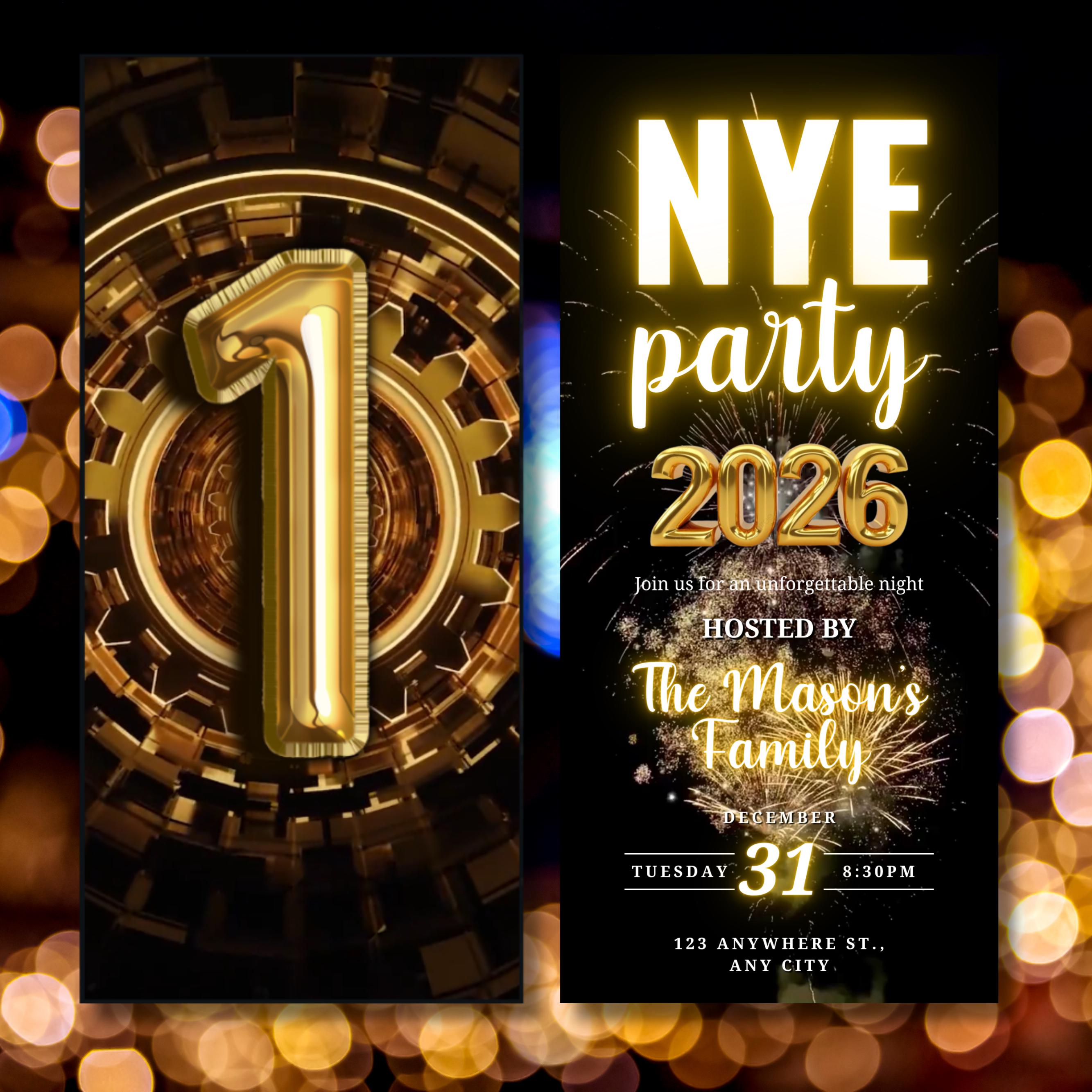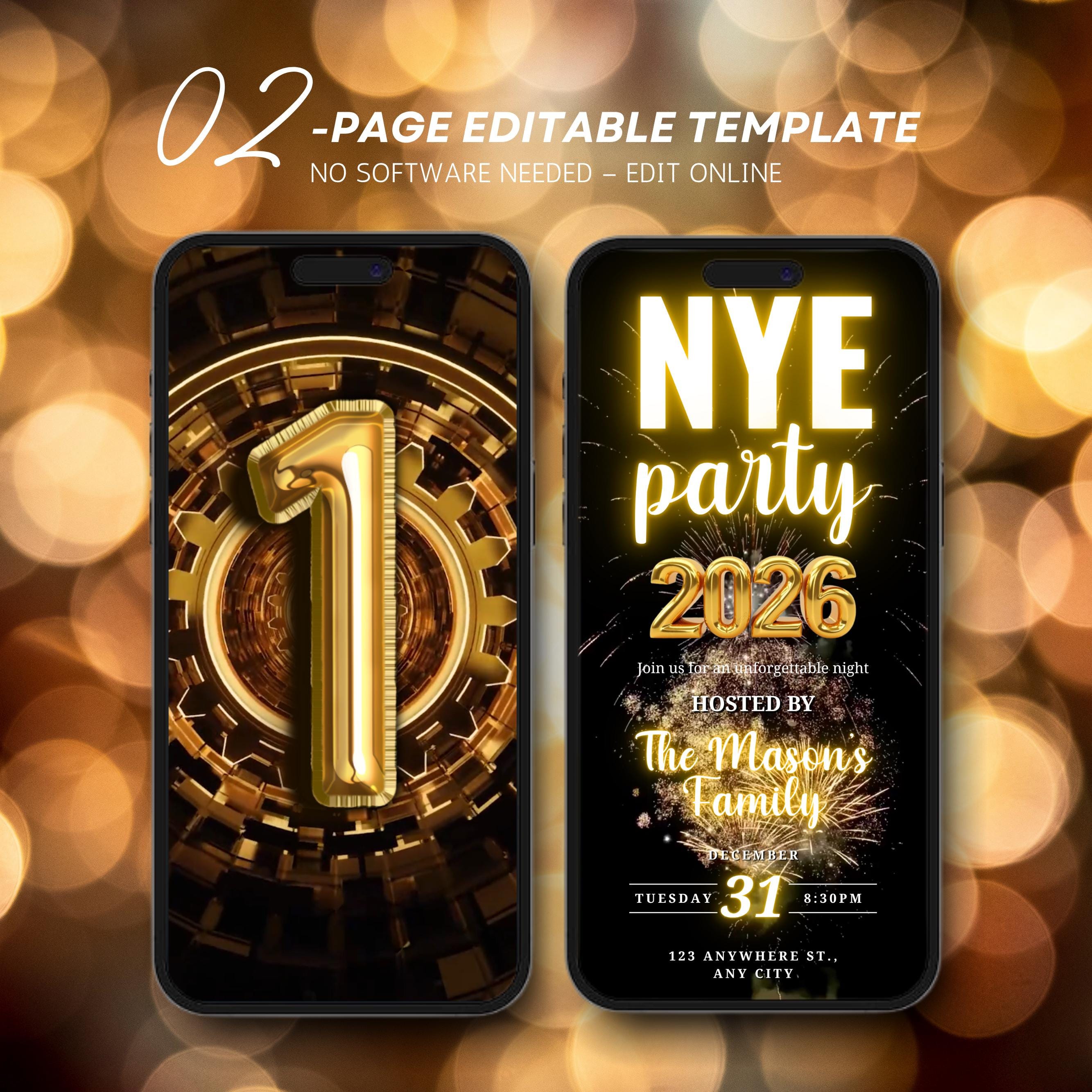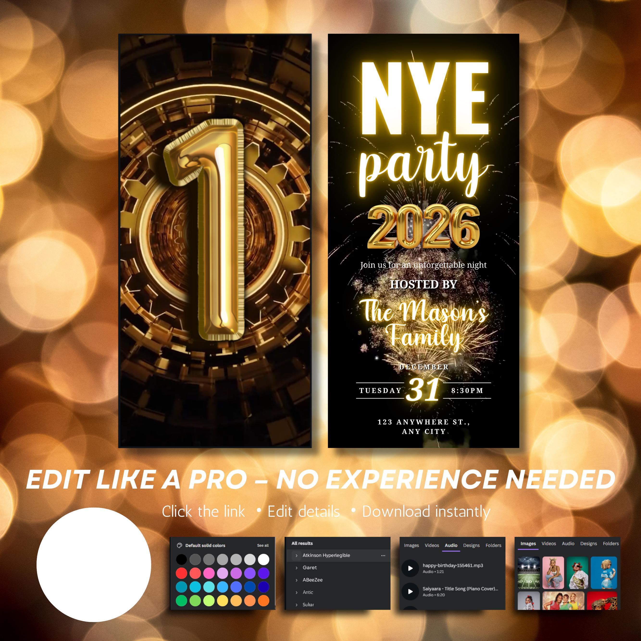 Animated New Year’s Eve Party Invitation 2026, Black Gold NYE Evite, Editable Digital Celebration Invite, Phone Text eCard, Canva Editable