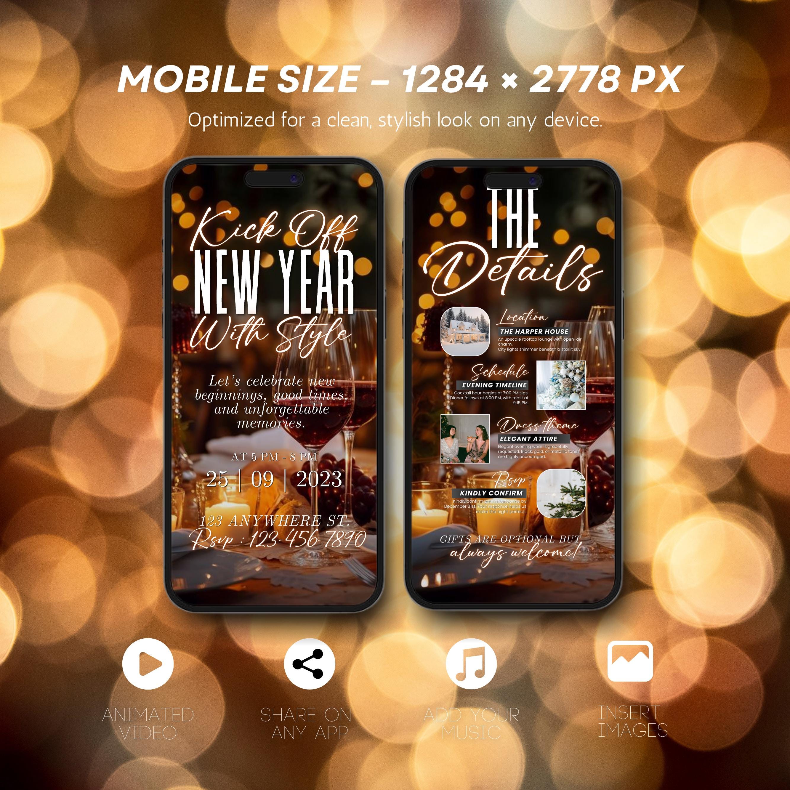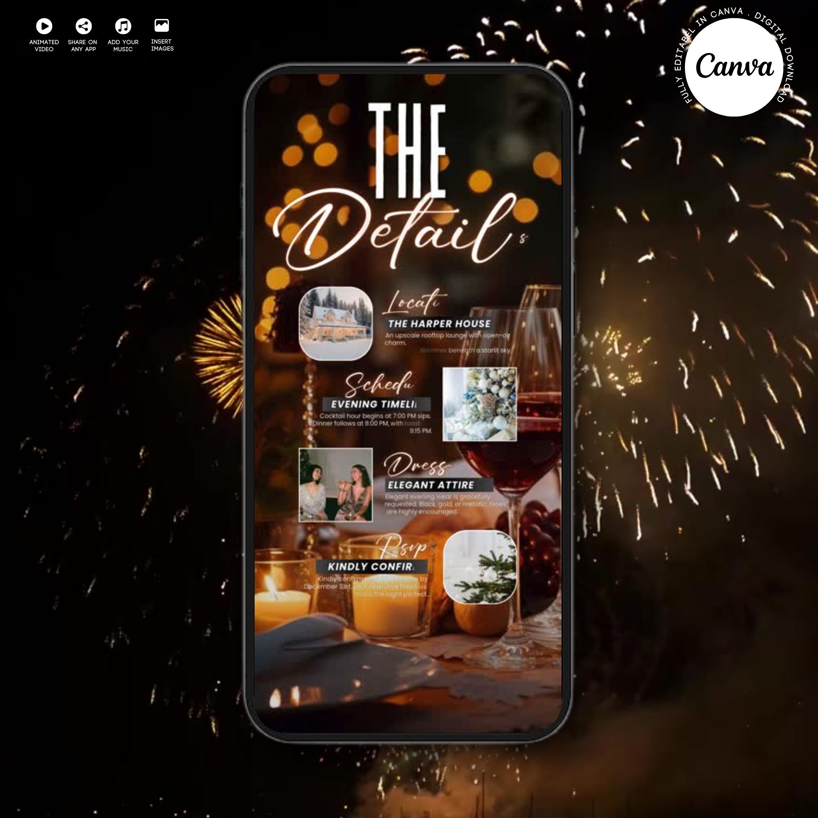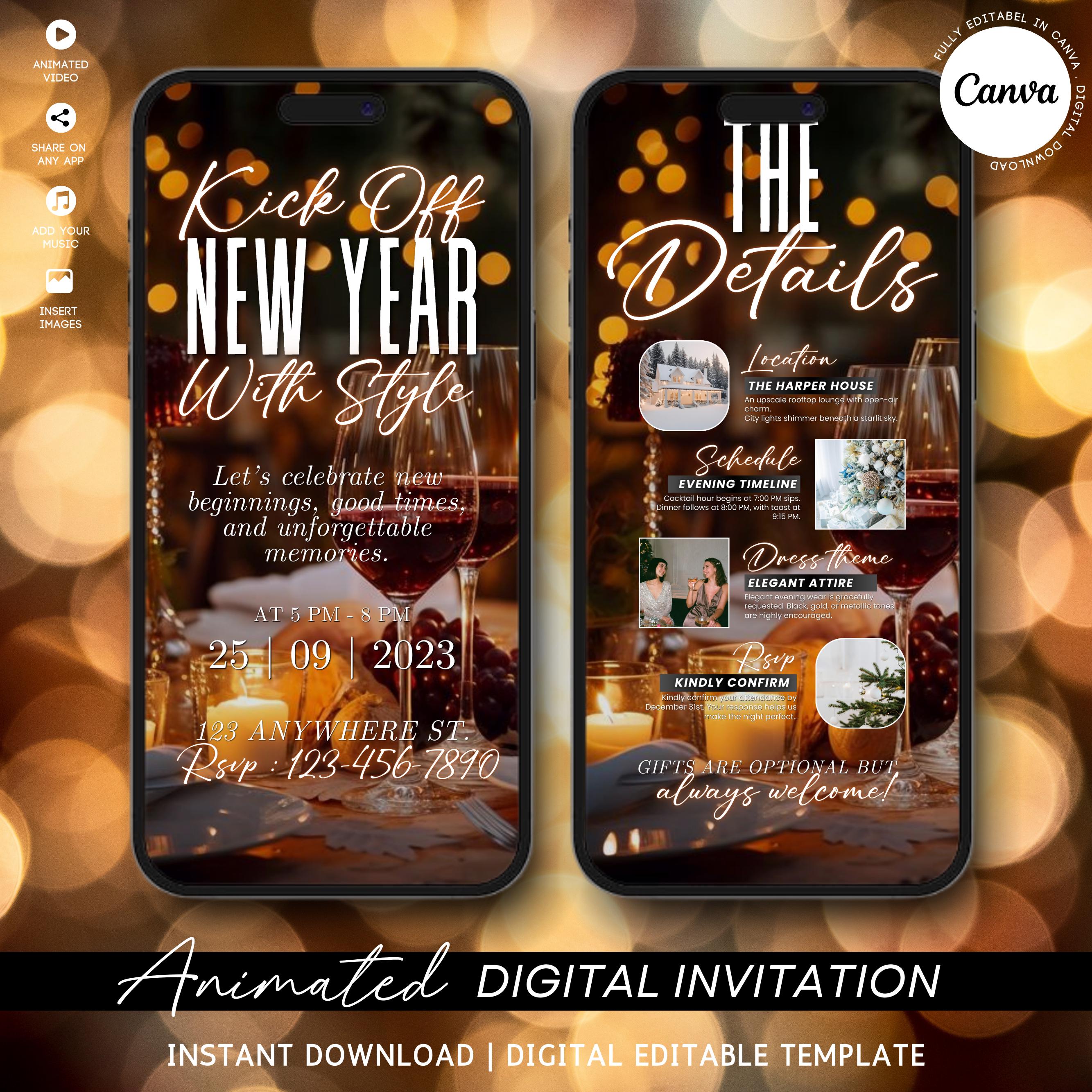 Animated New Year’s Eve Party Invitation 2026, Black Gold NYE Evite, Editable Digital Celebration Invite, Phone Text eCard, Canva Editable