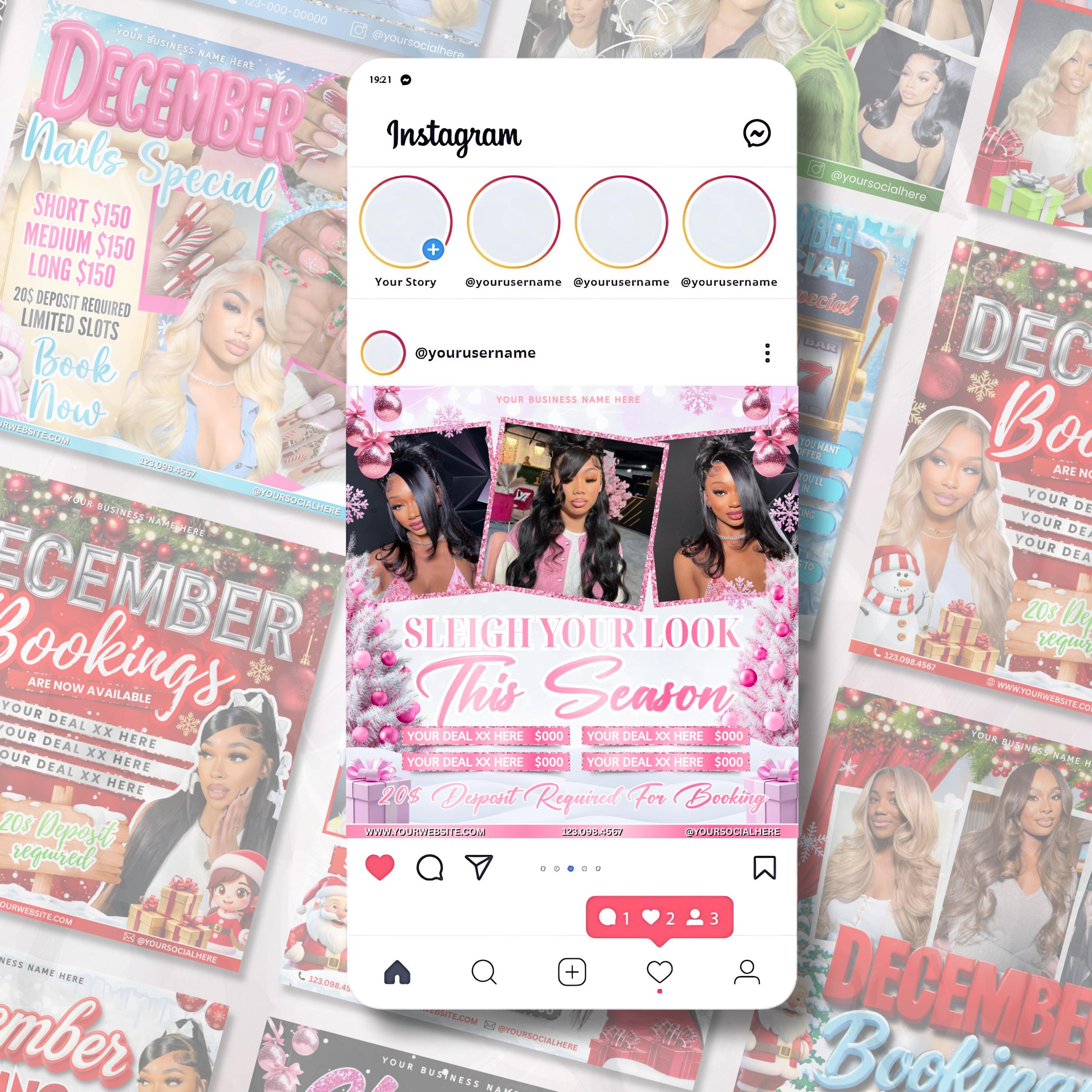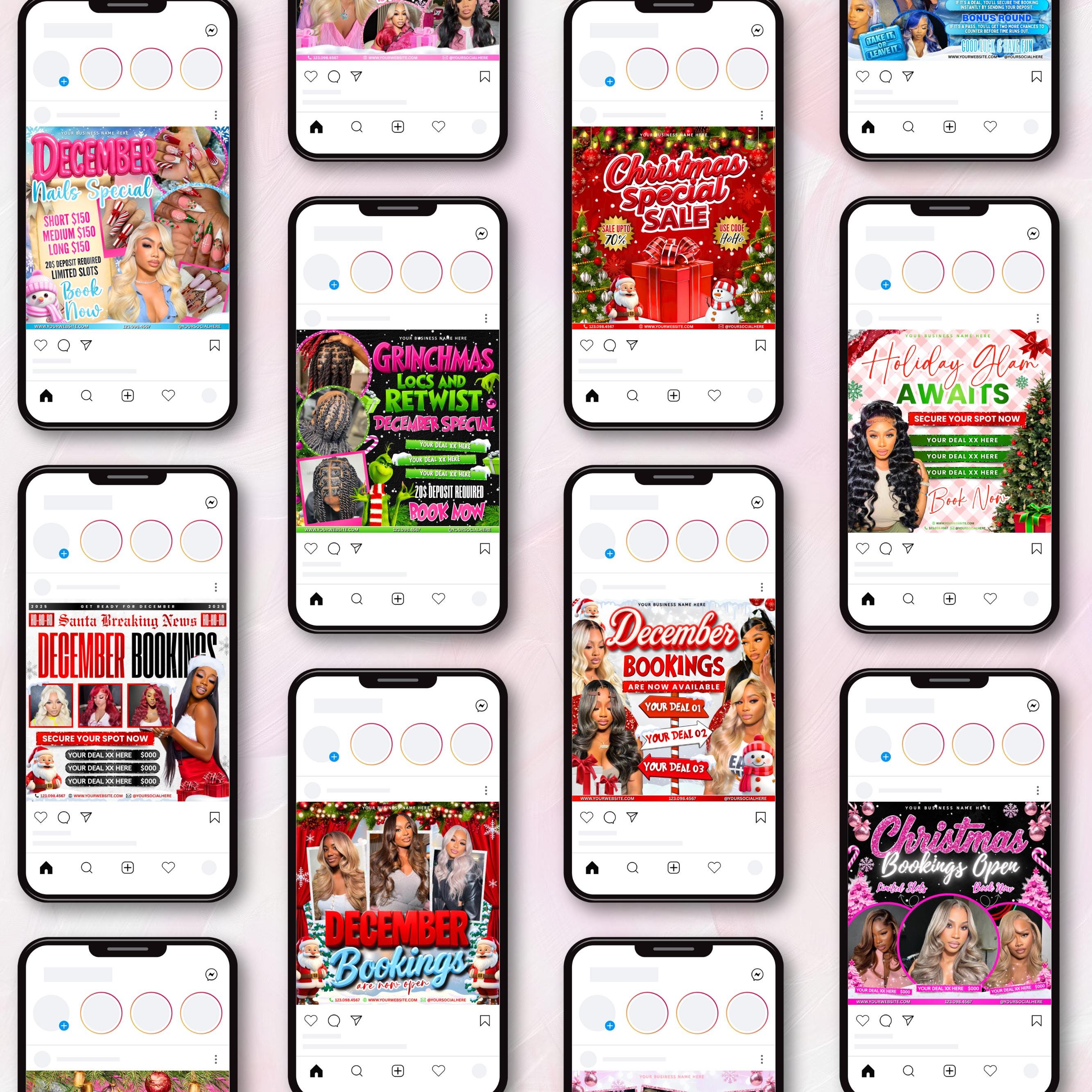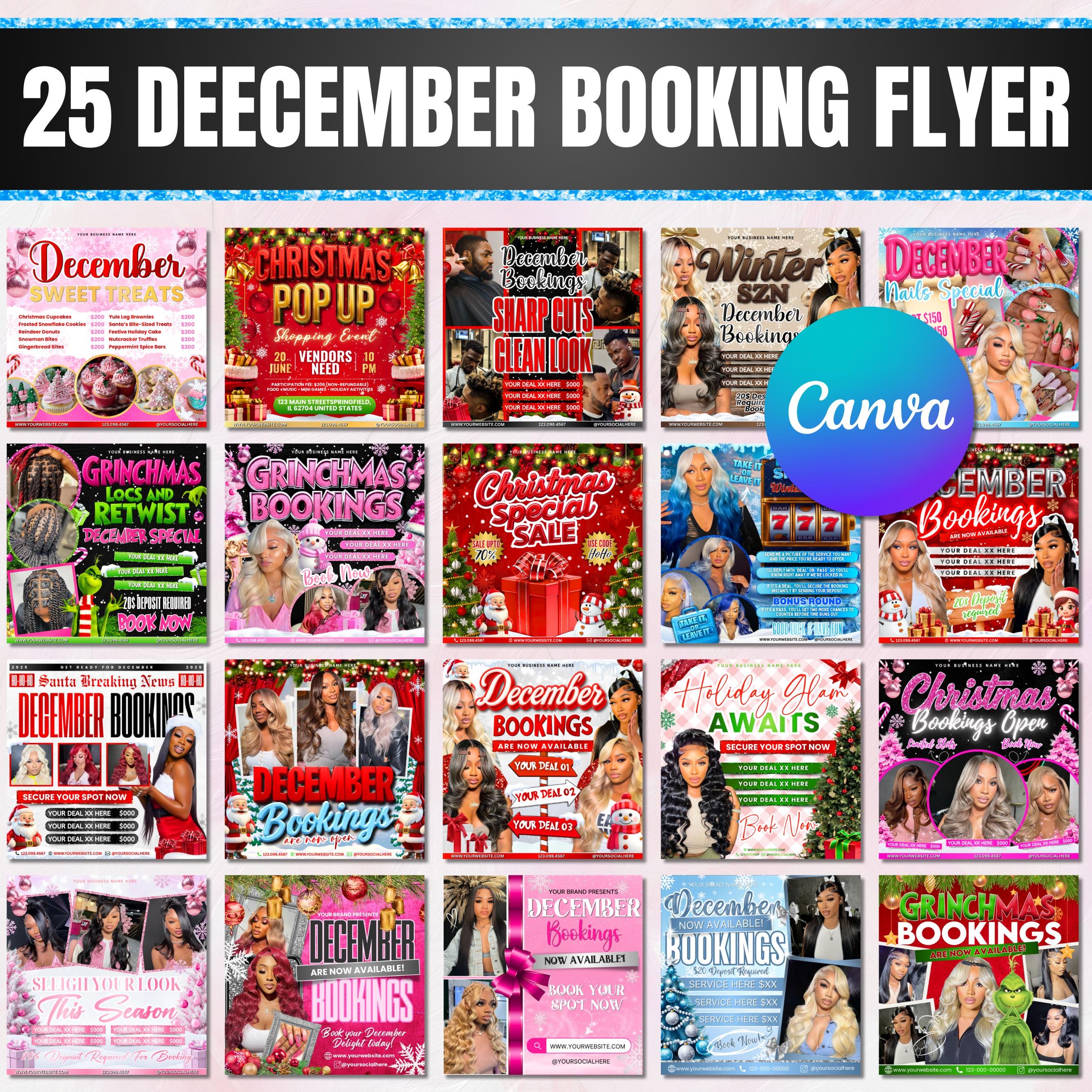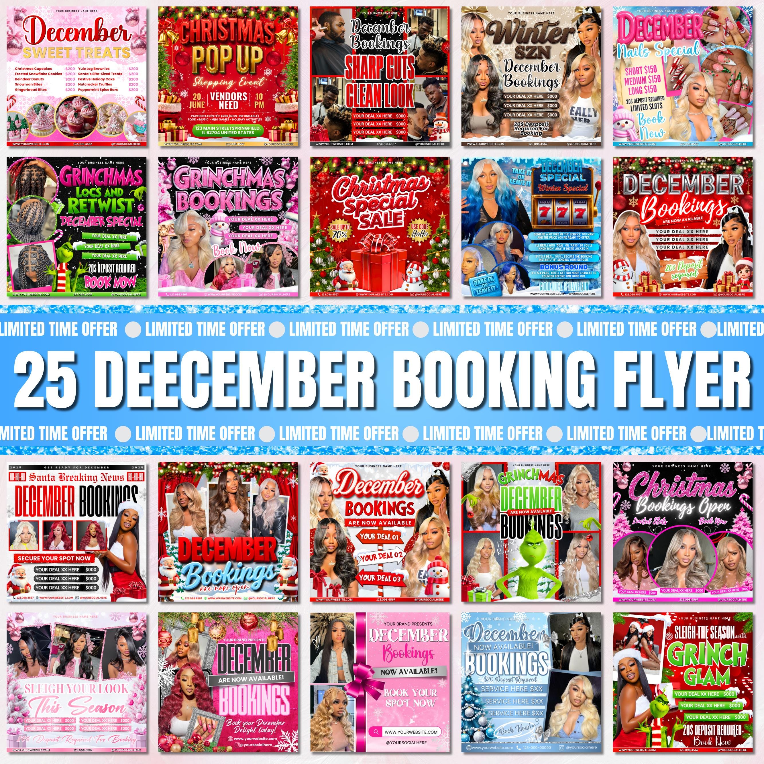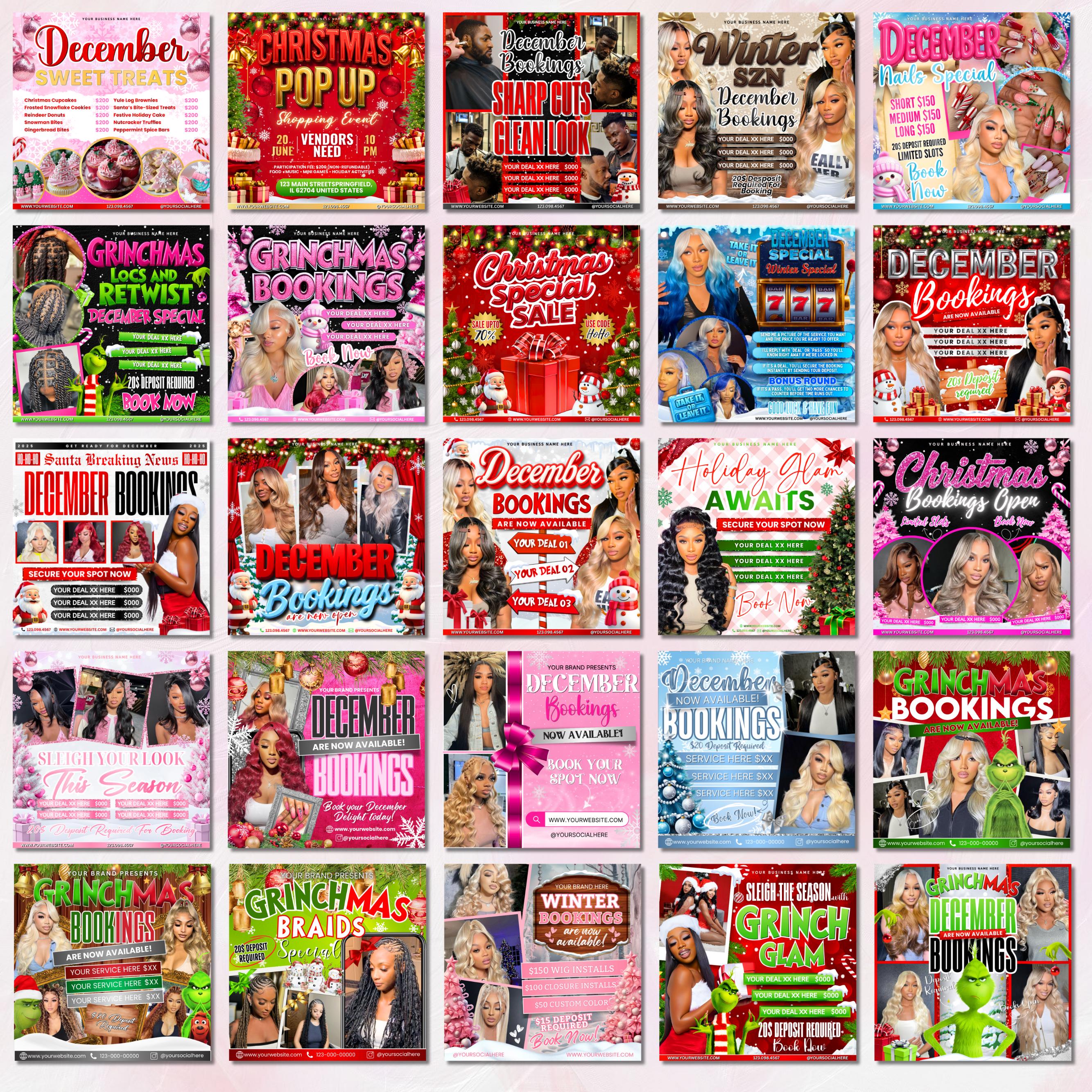 December Booking Flyers, Christmas Booking Flyers Bundle, Grinchmas booking flyers, Holiday Flyers Bundles, Hair Lash Makeup Nails Wig Flyer